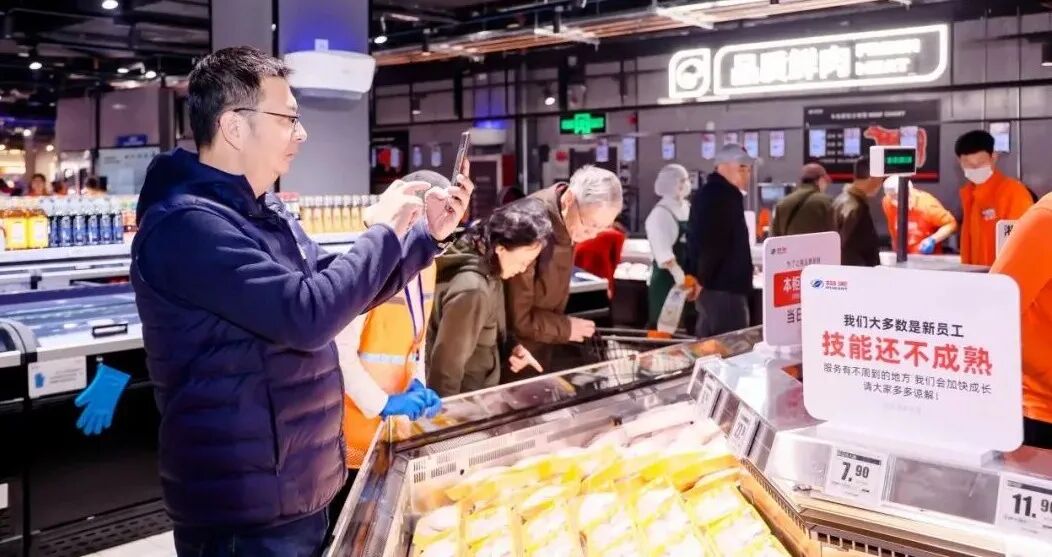 超市入口专门设了“一站式便民服务区”,配备10余项基础服务,推出宠物寄存、无障碍购物通道等包容性服务,为购物者提供了有温度的购物体验。