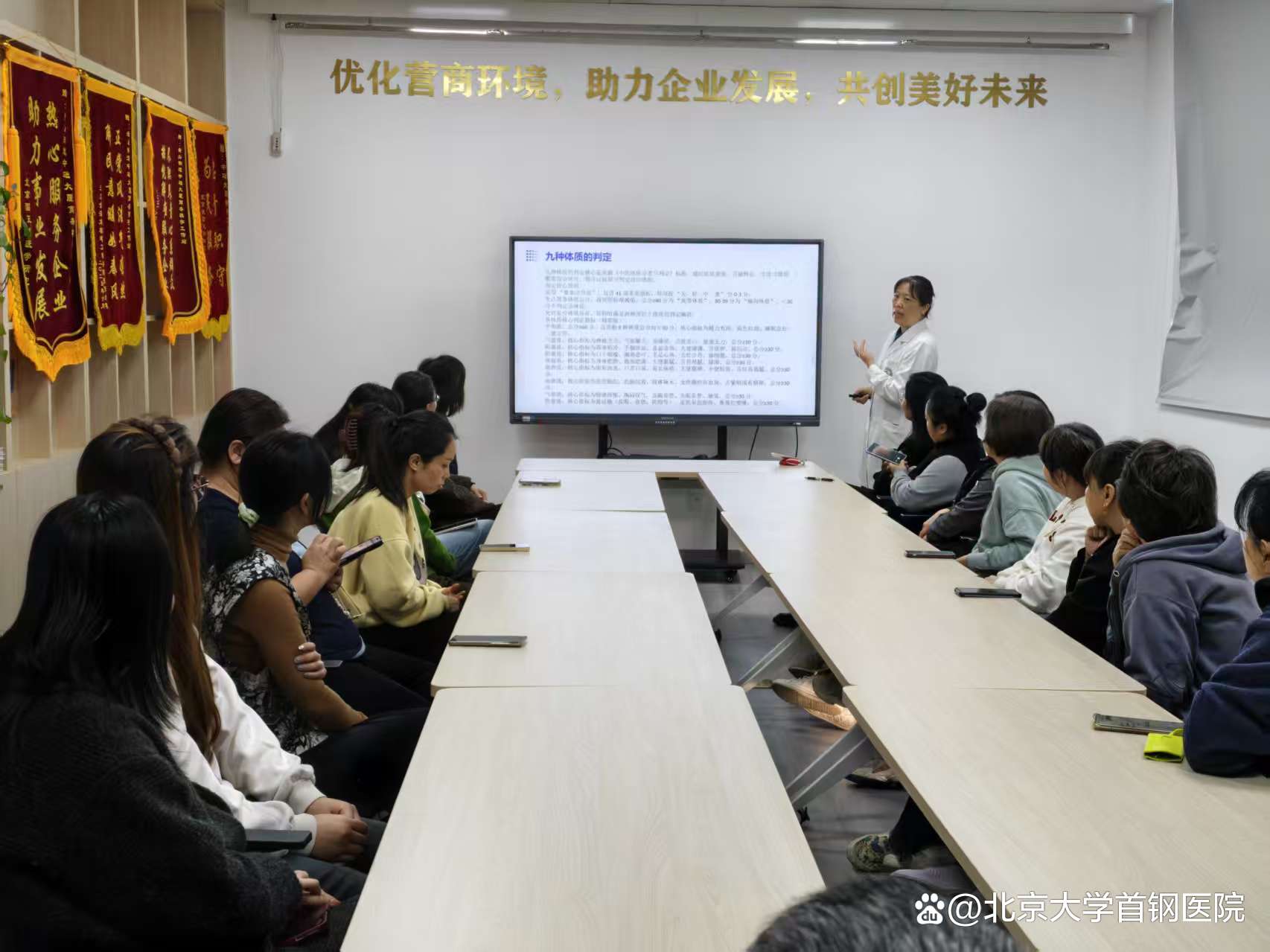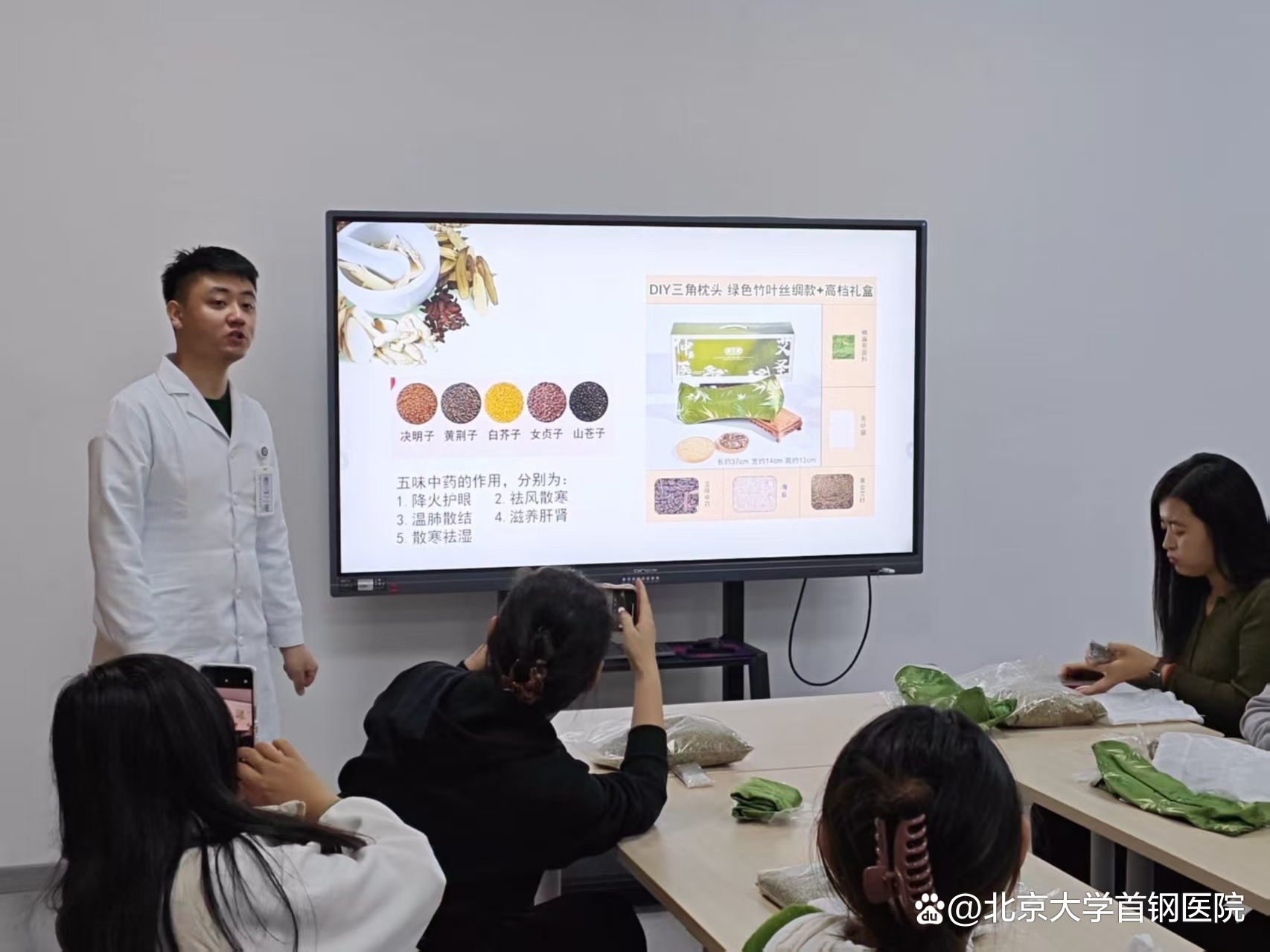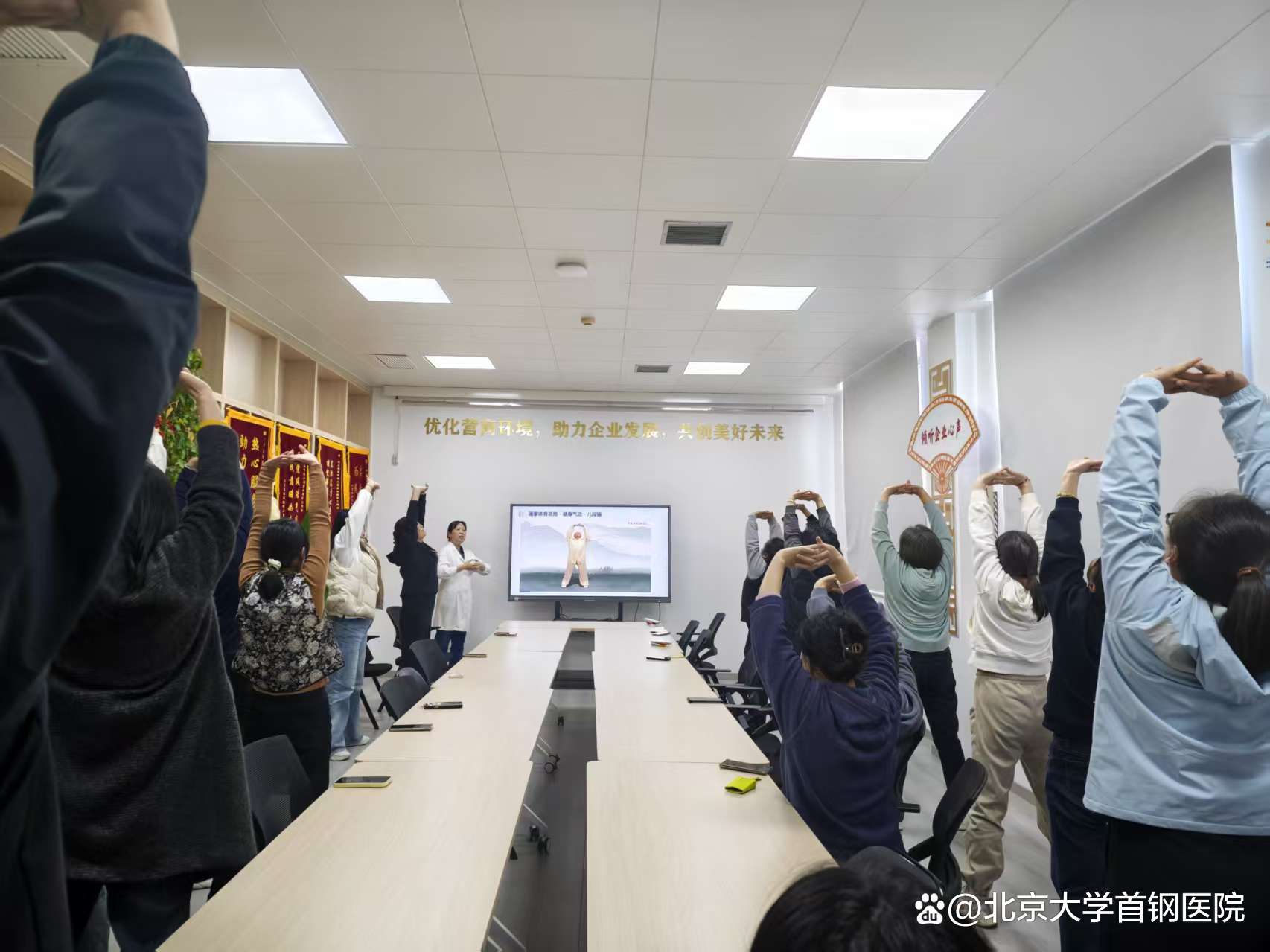 同日下午,北京大学首钢医院将健康服务送进中础大厦。老年医学科为企业职工带来了一场以“中医体质类型与健康”为主题的沉浸式养生体验活动。通过线上体质测试、理论讲解、八段锦练习与手工DIY的多元形式,让参与职工在互动中深入理解中医养生理念。
