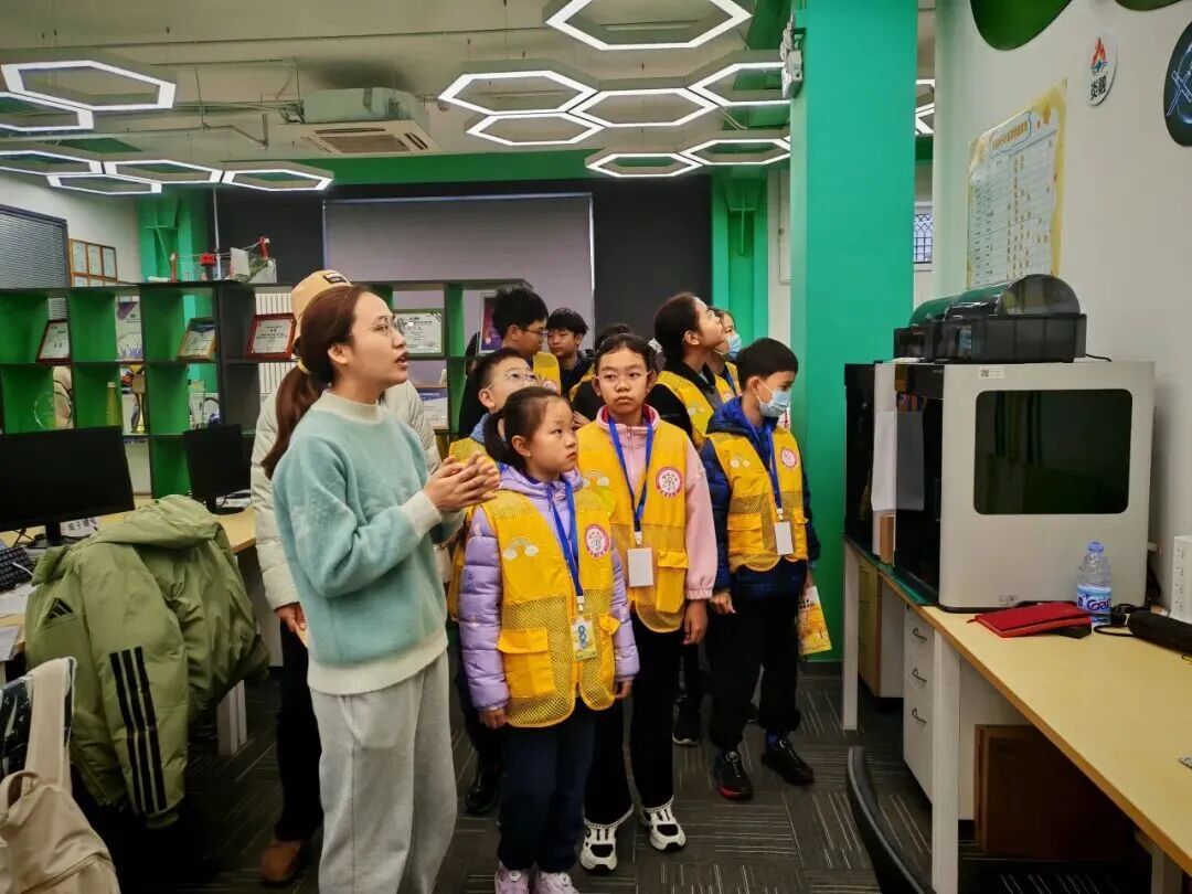 走进北科大贝壳创空间,孩子们的目光瞬间被一件件创新作品吸引。在创新创业学院讲解员的引导下,大家参观了智能硬件、创意设计作品和学生创业项目成果。造型别致的空气鼓锤凭借无接触的互动方式和奇妙的发声原理,成为全场的“人气焦点”。孩子们排着队争相体验,小手挥动间,清脆声响不断传出,好奇提问此起彼伏,现场气氛热烈。