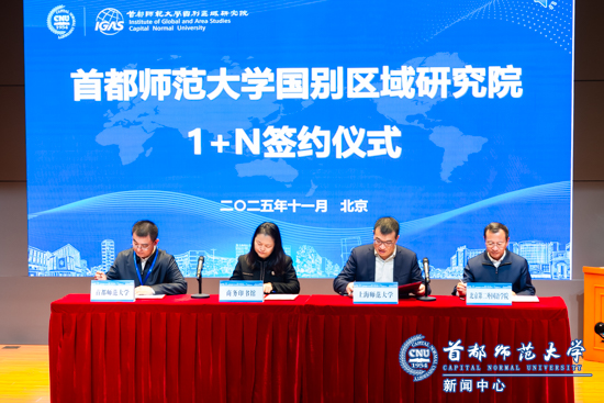 在开幕式上,与会嘉宾共同见证了首都师范大学国别区域研究院“1+N”的合作签约仪式。王洛忠与北京第二外国语学院校长计金标教授、上海师范大学人文学院世界史系陈恒教授和商务印书馆总编辑叶军共同签署了“1+N”合作协议。计金标表示,区域国别研究是文明交流互鉴的桥梁,北京第二外国语学院将积极参与协同攻关,共同产出服务于国家战略和文明交流的高质量成果。陈恒倡导历史学者积极介入,促使区域国别研究走向纵深。作为首期《文明研究》新刊主编,他提出中国的文明研究要拓宽领域,不以文明优越或冲突为出发点,而是立足于文明对话与平等。叶军表示,《文明研究》切中时代渴求,在这块共同耕耘的学术园地里,百年商务的传播力量与前沿学术的创新能力深度融合,共同构建中国自主的区域国别学的知识体系。最后,叶军和首都师范大学国别区域研究院院长梁占军共同为《文明研究》新刊发布仪式进行揭幕,与会学者共同见证了这一学术新平台的起航。