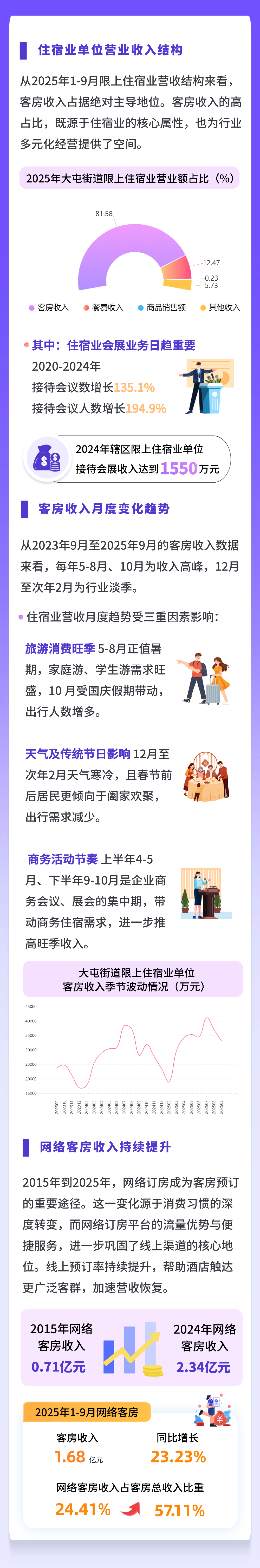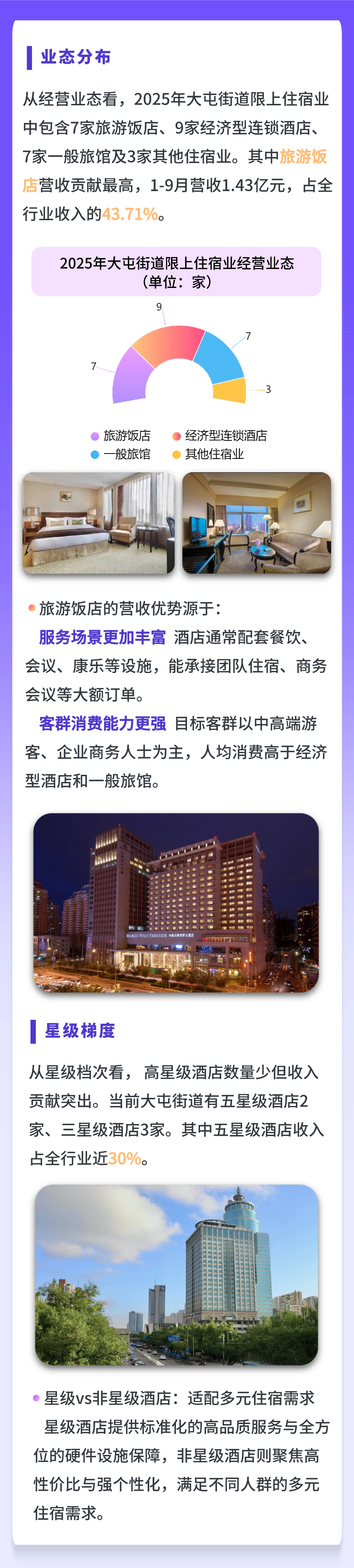 住宿业作为城市服务的核心载体,既是民生保障的“窗口”,也是文旅消费的“枢纽”。从数据脉络看,大屯街道住宿业已进入从“疫情复苏”到“质量提升”的关键跨越,行业韧性与活力持续增强。2025年9月,大屯里商业街正式开街,亚朵酒店、桔子水晶酒店、海友酒店3家连锁品牌,为区域住宿业发展注入新活力。