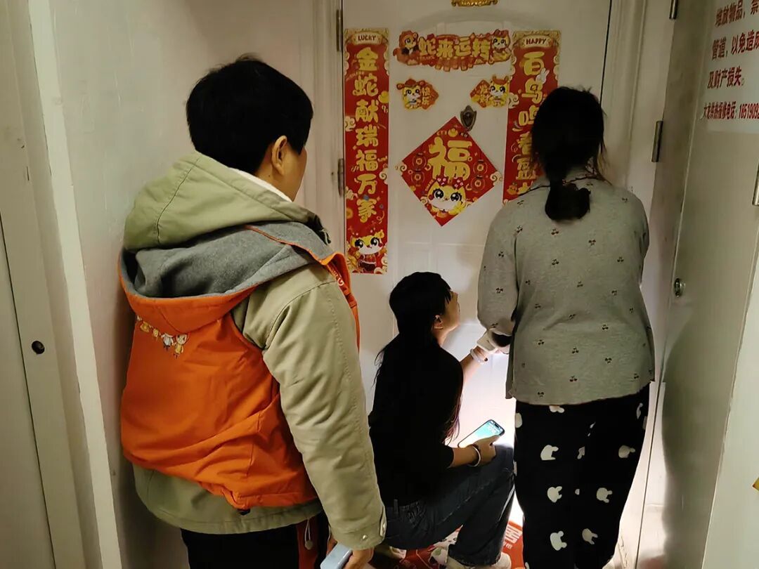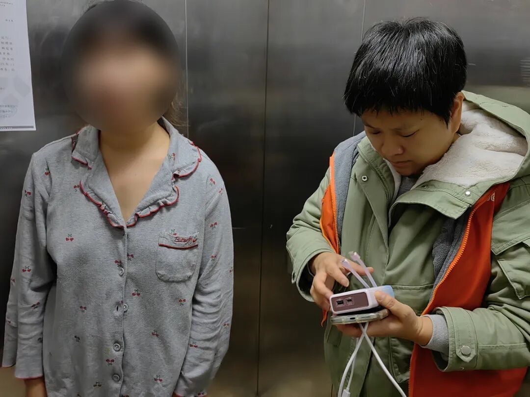 这时,楼上邻居艾女士刚下夜班回家,得知事情原委后,顾不上休息,她马上拿来充电宝,给密码锁充电。但是,艾女士的充电宝电量不足,两人多次尝试后仍无法打开防盗门。随后,薛女士走出楼栋继续寻找解决办法,艾女士则守在门口,时刻留意屋内动静。