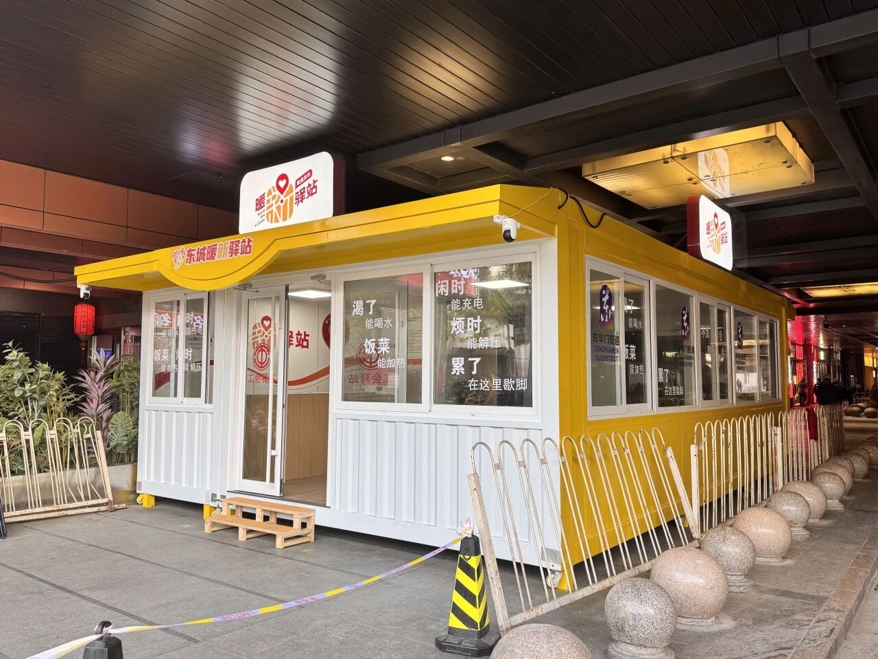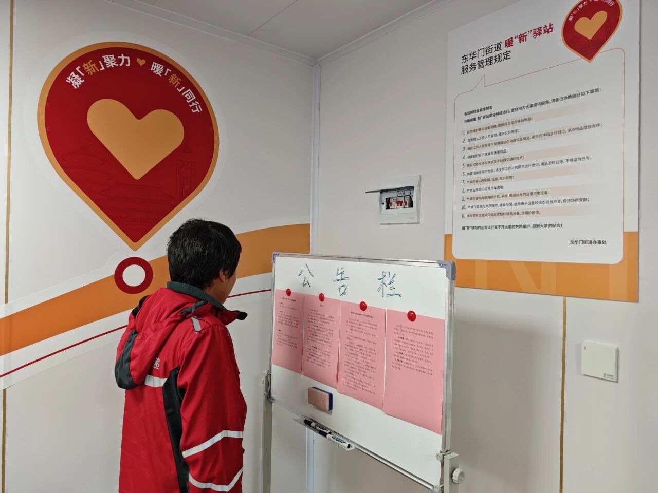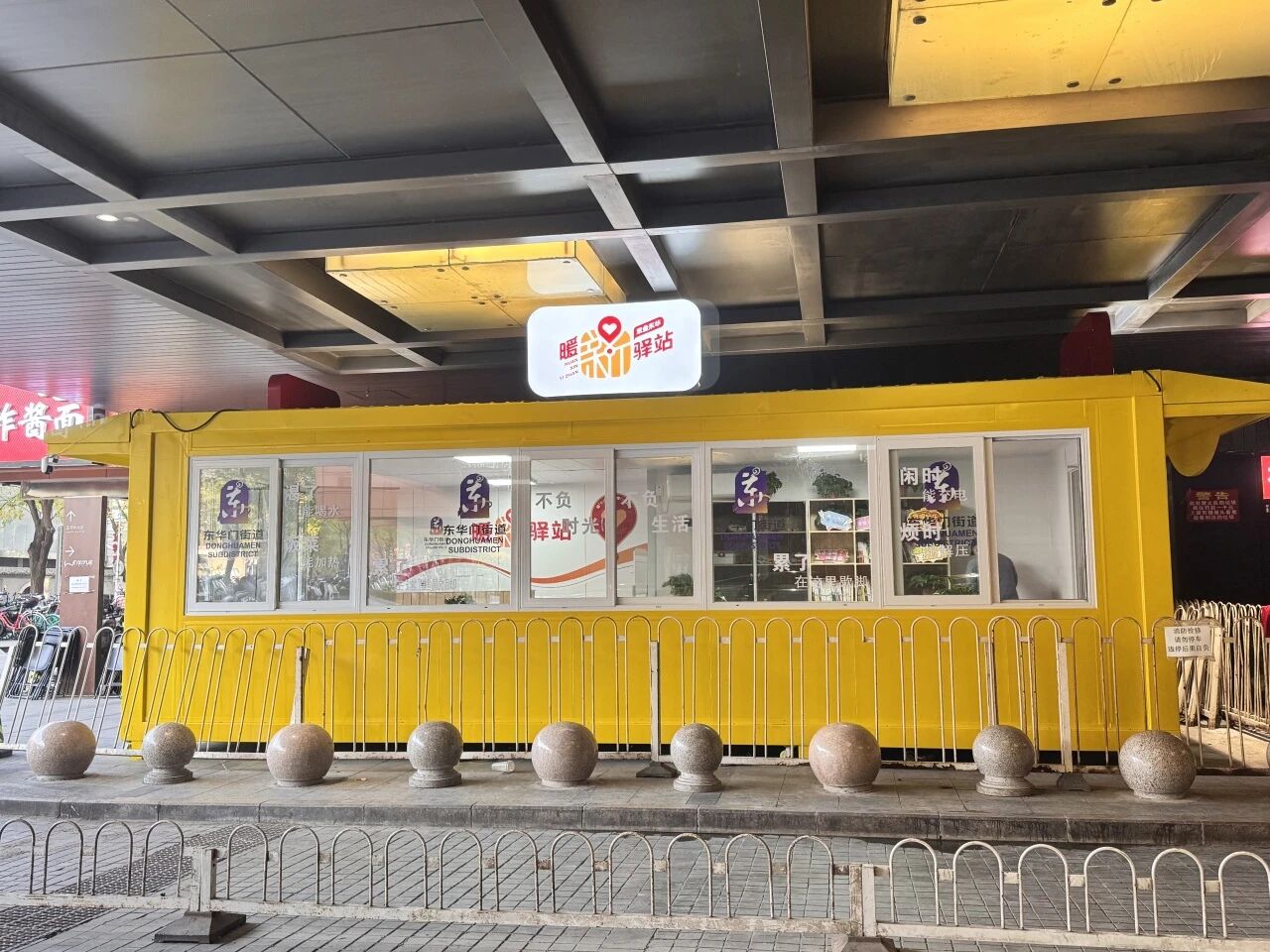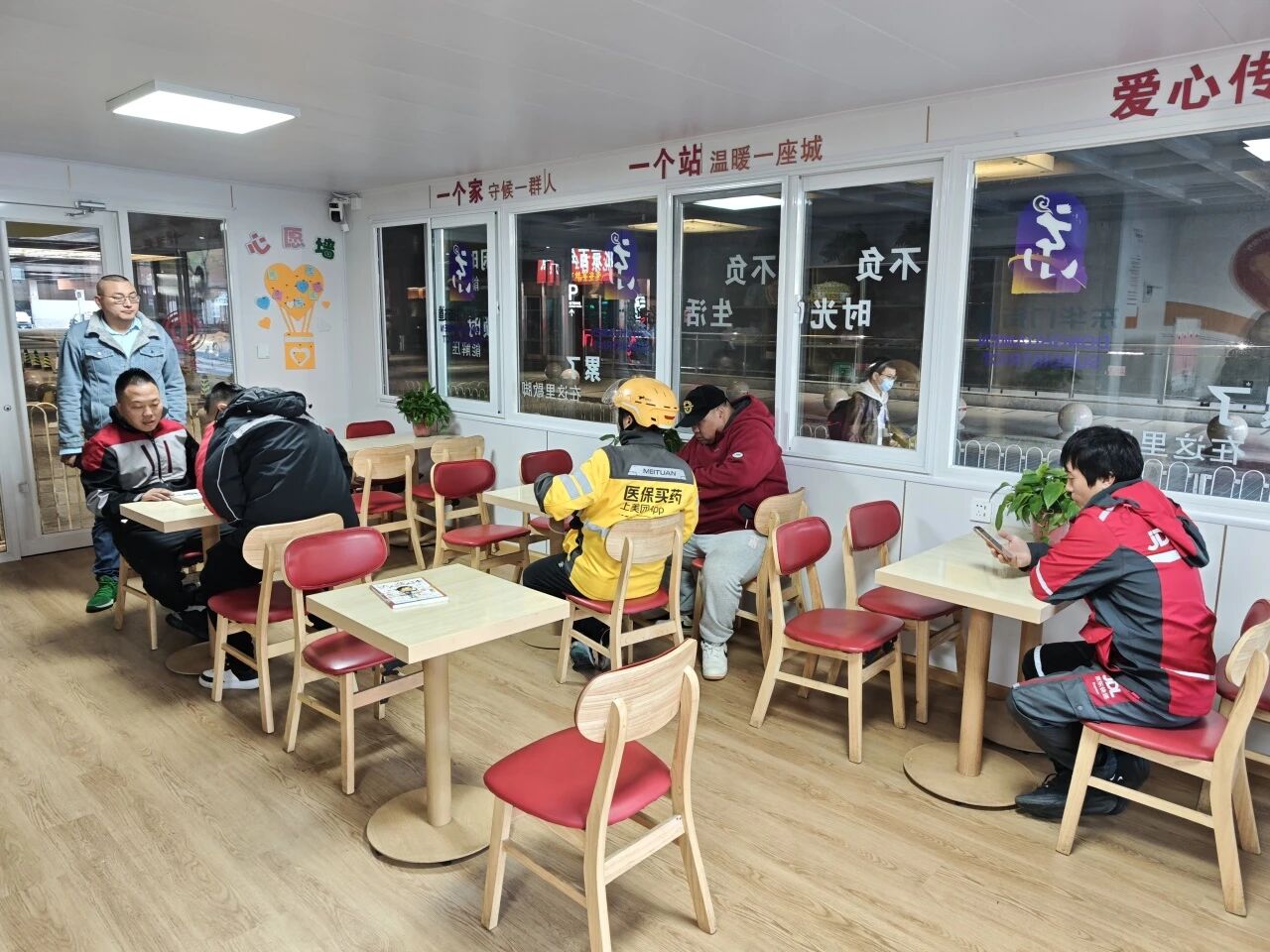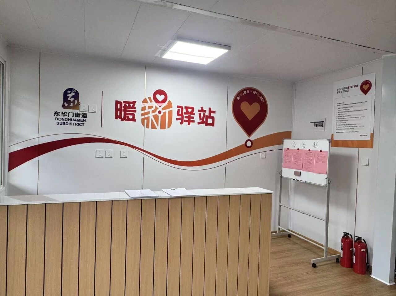 东华门街道暖“新”驿站位于王府商厦西侧过街楼处,为新就业群体在王府井商圈提供了休憩空间。硬件设施上,采用防火岩棉与瓦楞板保障箱体坚固,内墙碳晶板、断桥铝窗框、双层玻璃兼具隔音、保温与防风功能,强化安全保障。软件服务上,驿站内配备饮水机、微波炉、药箱、急救箱、雨伞等基本设施,全屋设置USB电源面板,基本能够满足新就业群体工作外的日常需求。