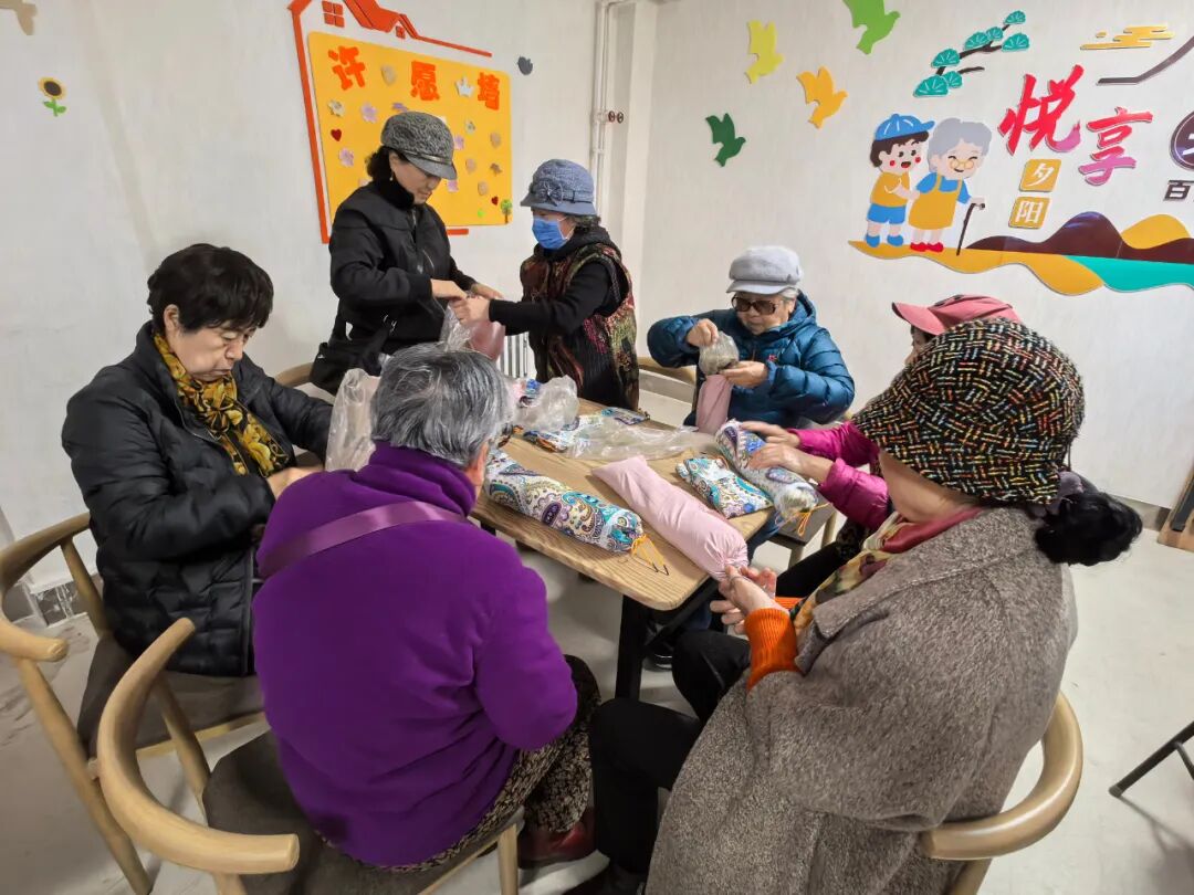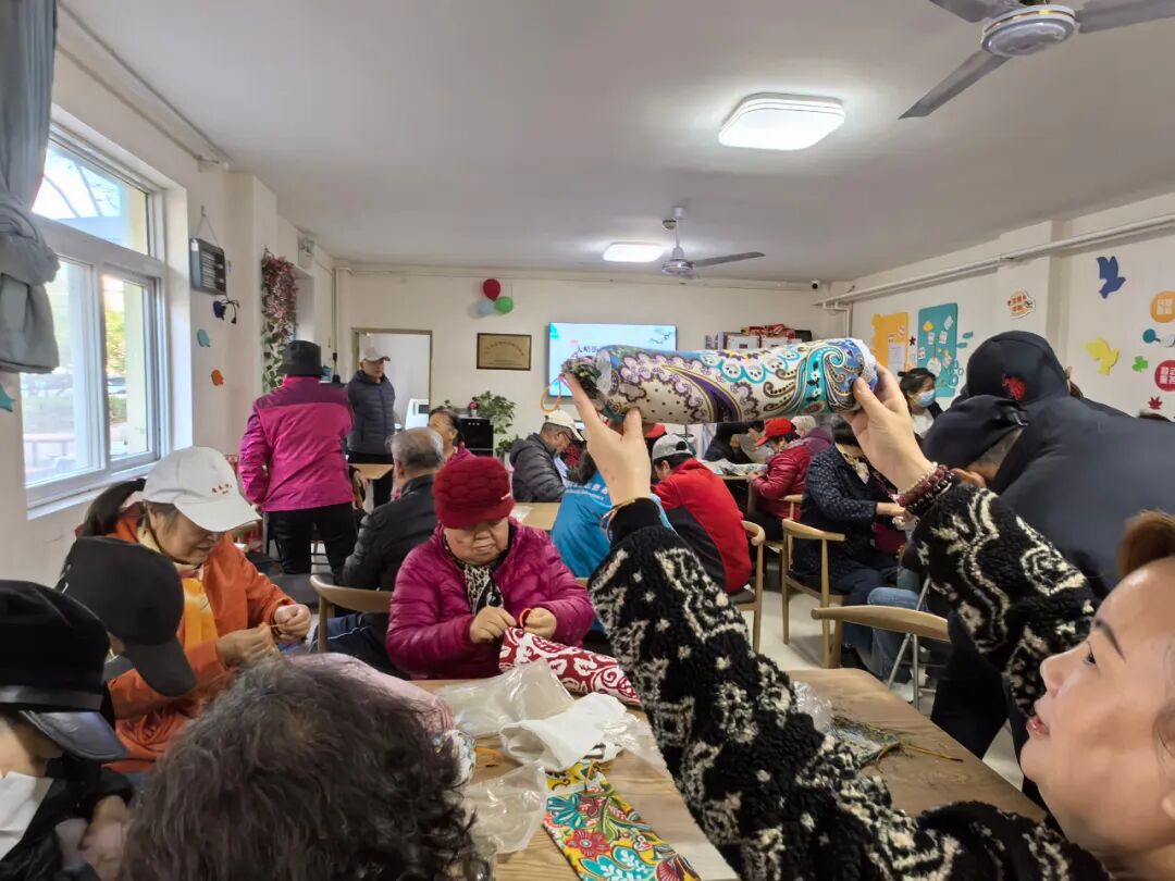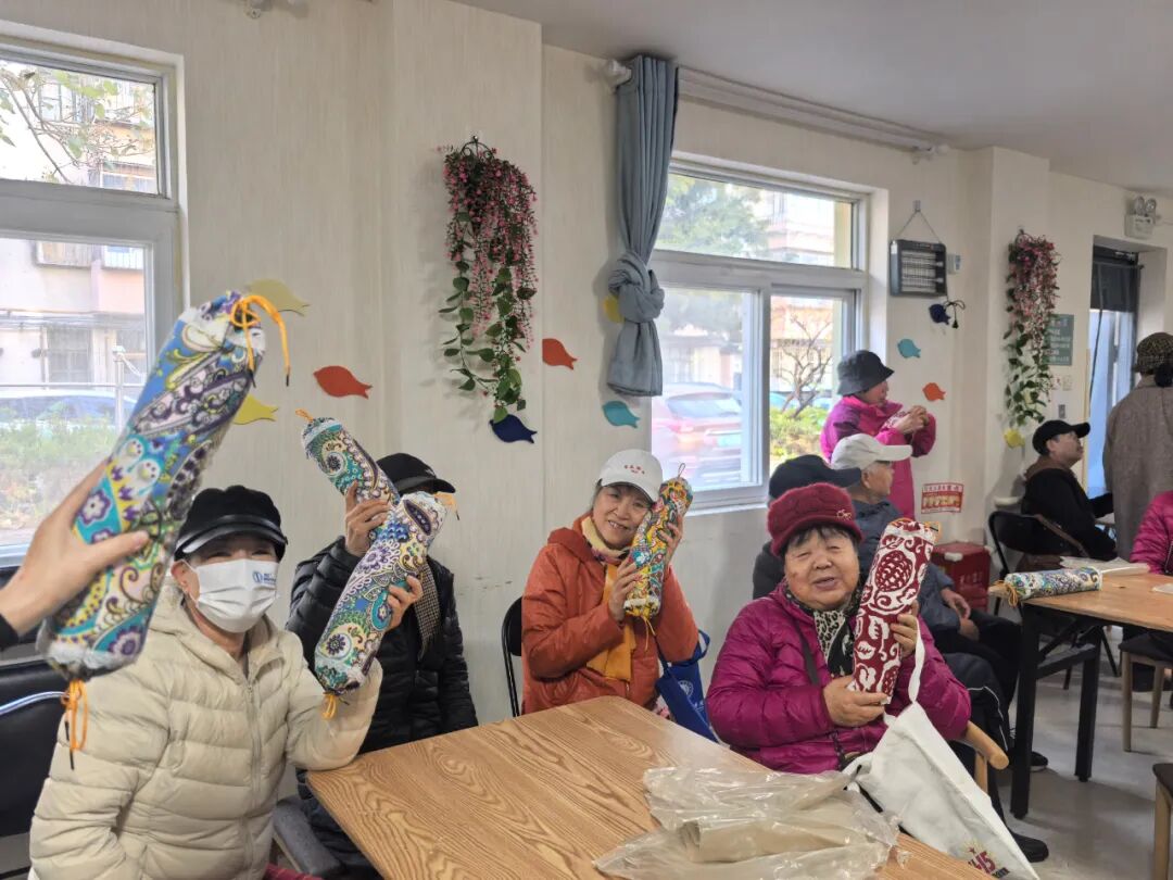 手工制作环节,驿站工作人员提前将艾草、布袋、装饰绳等材料分发给每位老人,并详细演示艾草枕的填充、制作等步骤。老人们兴致高昂,相互交流技巧,有的独自专注制作,有的结伴协作,现场充满欢声笑语。工作人员穿梭其中,为行动不便的老人提供协助,指导大家合理控制艾草用量,确保艾草枕的使用效果。经过近 1 小时的忙碌,一个个造型精致、散发着淡淡艾草香的手工艾草枕顺利完成,老人们手捧着自己的作品,脸上洋溢着满足的笑容。