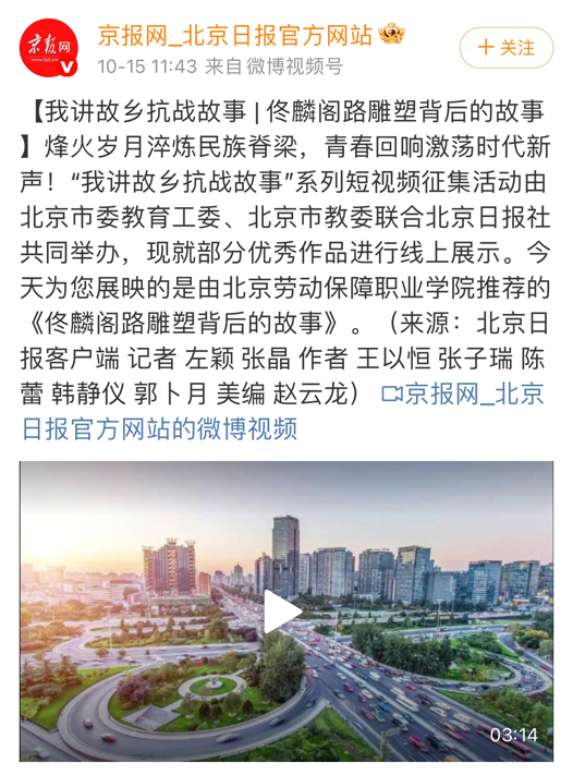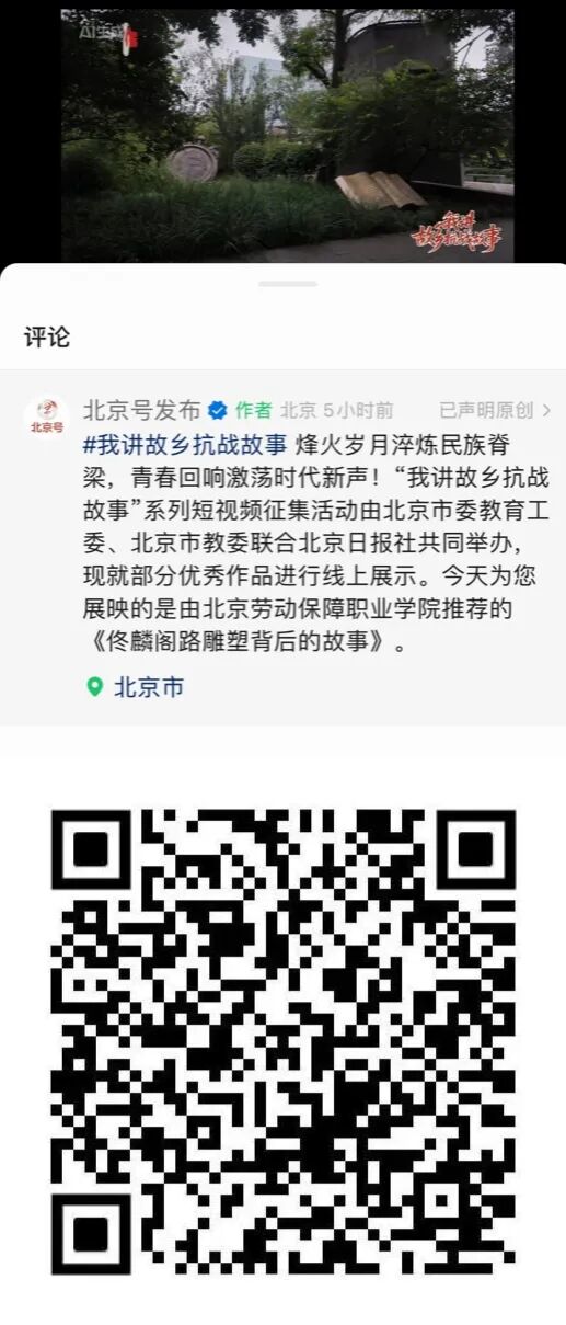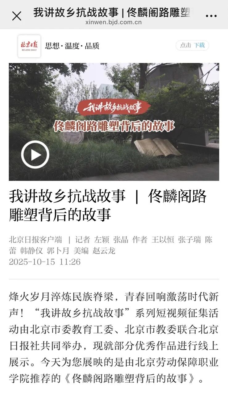 为纪念中国人民抗日战争暨世界反法西斯战争胜利80周年,北京市委教育工委、北京市教委联合北京日报社举办了“我讲故乡抗战故事”短视频征集活动。我院学子创作的《佟麟阁路雕塑背后的故事》从700余部参赛作品中脱颖而出,成功入围,目前已在北京日报客户端等新媒体全平台正式展播。