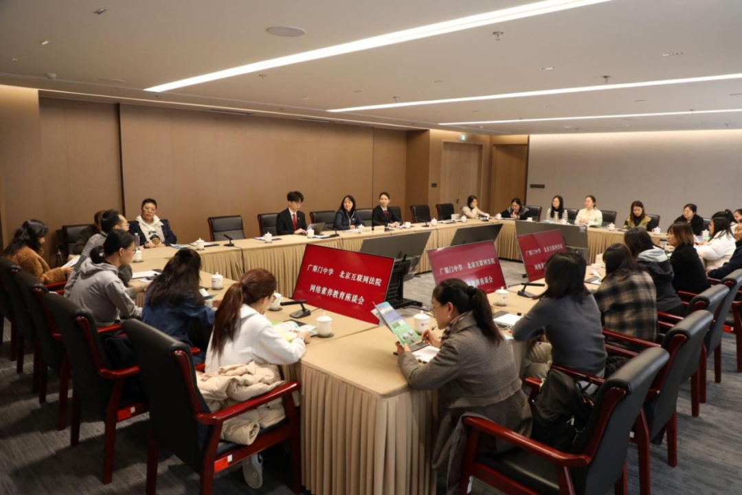 座谈会上,孙铭溪副院长首先对广渠门中学教师团队的到访表示热烈欢迎。她提到,自北京互联网法院在广渠门中学挂牌首家“青少年网络法治素养基地校”以来,双方携手共建逐步形成了具有示范意义的网络素养教育入校的“广中模式”。北京市广渠门中学德育主任高泳锦对北京互联网法院提供的参观交流机会表示感谢。她表示,此次参观交流旨在深入学习经验,进一步推动法院与学校之间的协同合作。随后,双方围绕青少年思政课教研、AI通识课程创新、案例教学实践、学生志愿者机制等多个方向展开深入交流,增进院校深入合作。
