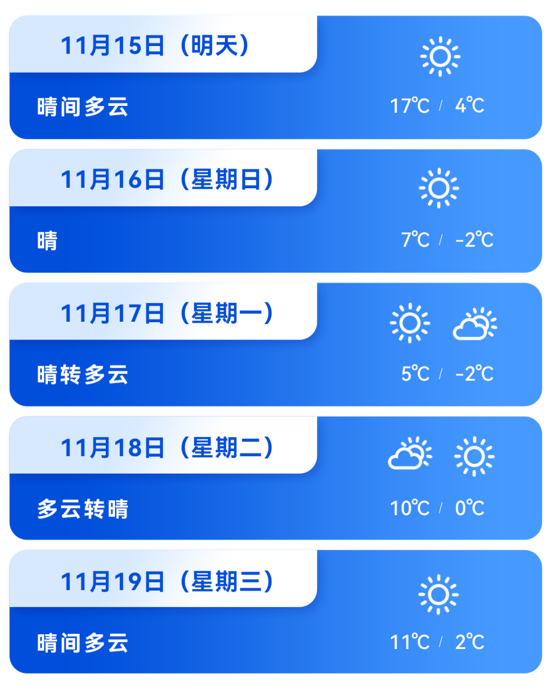 据区气象台消息,今天夜间晴间多云,南转北风1、2级,最低气温1℃;周六晴间多云,夜间南转北风2级转3、4级,阵风7级左右,气温17~4℃;周日晴,偏北风4级左右,阵风7、8级,气温7~-2℃。