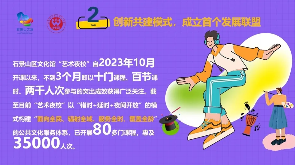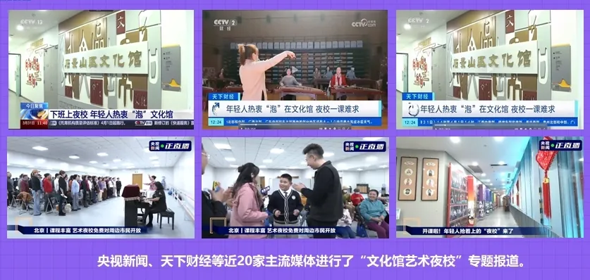 石景山区文化馆“艺术夜校”自2023年10月开课以来,不到3个月即以十门课程、百节课时、两千人次参与的突出成效获得广泛关注。截至目前,“艺术夜校”以“错时+延时+夜间开放”的模式构建“面向全民、辐射全域、服务全时、覆盖全龄”的公共文化服务体系,已开展80多门课程,惠及35000人次。央视新闻、人民日报等近20家主流媒体进行了专题报道,文旅部专家团队及全国各地多家文旅单位到访石景山区文化馆开展了专题调研。这份亮眼成绩单的背后,是“政府主导、社会参与、全民共享”的创新实践逻辑。