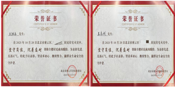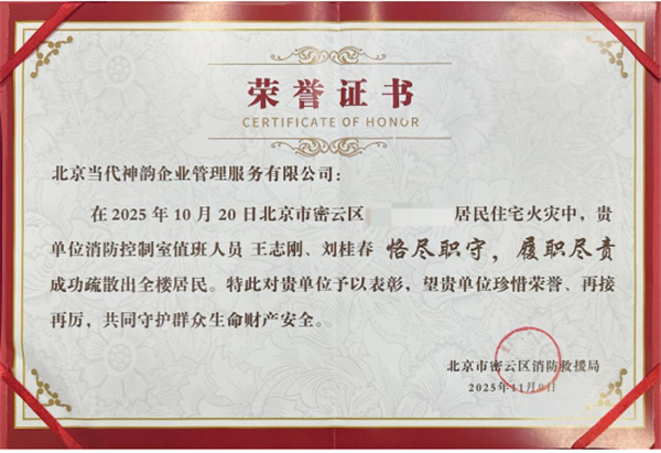 11月13日,北京市密云区消防救援支队为北京当代神韵企业管理服务有限公司及职工王志刚、刘桂春颁发荣誉证书,表彰他们在10月20日所管辖小区火情处置中的突出表现。此次表彰既是对物业应急处置能力的肯定,更彰显了企业守护业主生命财产安全的责任担当。