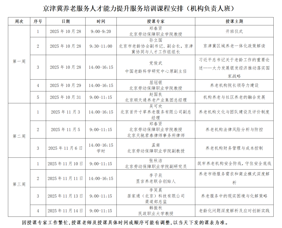 本次培训设养老机构负责人、管理人员、养老护理员三个类别班级,具体如下:
