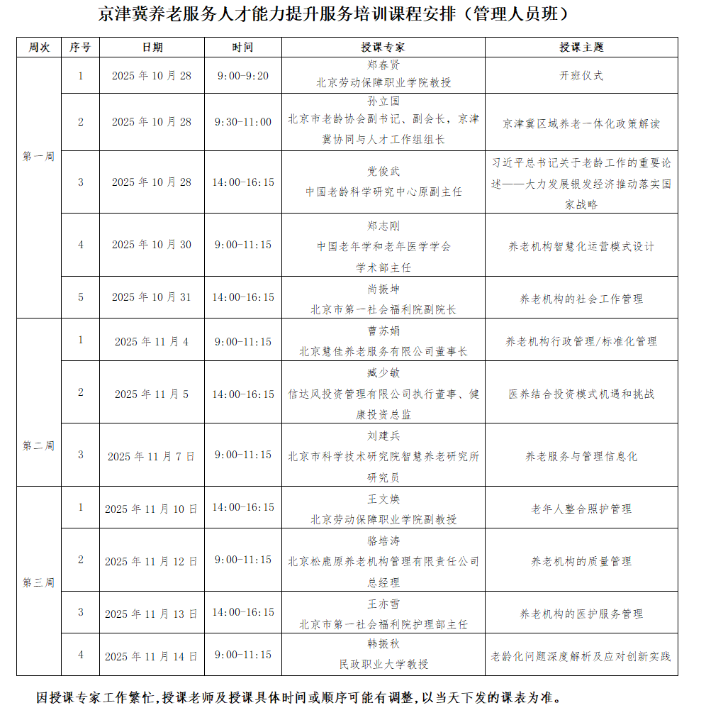(二)管理人员培训班(32学时)。主要以政策解读、标准化管理、质量管理、合同管理、智慧化运营模式设计为培训内容,并适时邀请京津冀三地四星级以上养老机构负责人、优秀管理人员分享工作经验。