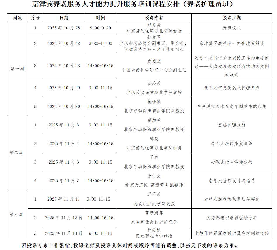 为贯彻落实习近平总书记在深入推进京津冀协同发展座谈会上重要讲话精神,推动京津冀养老服务人才协同发展,促进三地养老服务人才互促共建,助力三地养老服务高质量发展,根据京津冀三地签订的《京津冀民政事业协同发展合作框架协议》等文件的有关规定,为做好三地养老机构负责人、管理人员、养老护理员等人员的培训工作,现就开展2025年京津冀养老服务人才能力提升服务线上培训有关工作通知如下: