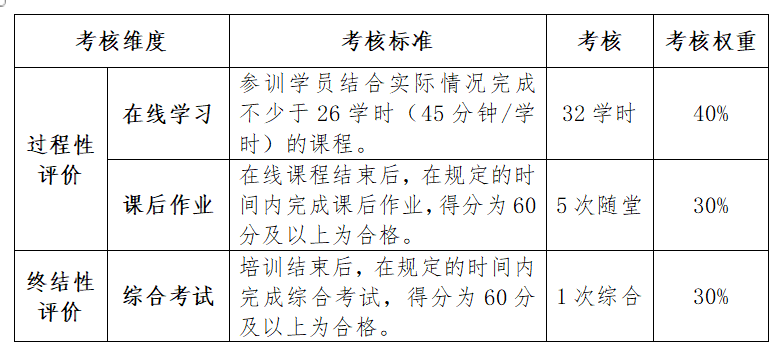 培训设置在线课程学习、随堂测试、综合考试等三个环节,具体考核要求如下: