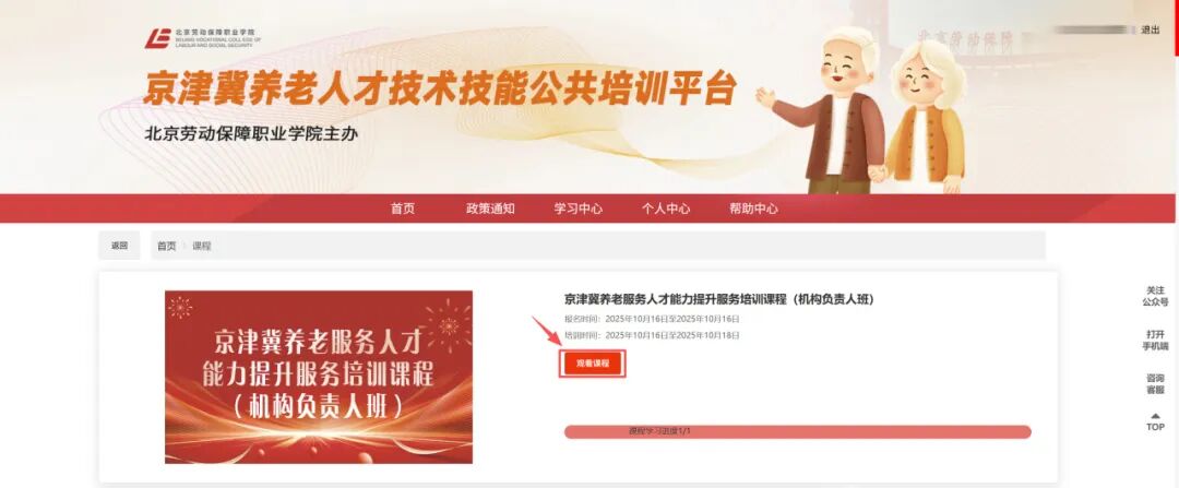 2.登陆后点击“观看课程”,进入播放页,点击播放按钮进行线上培训直播的学习观看。