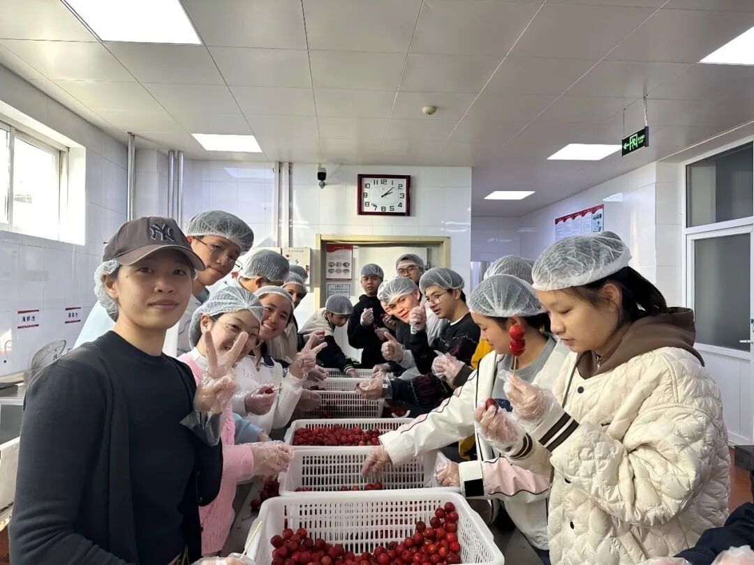 日前,民生福祉学院联合学校食堂共同举办特色活动——“劳动酿甜糖葫芦,校园巧作传匠心”。国际教育学院组织泰国留学生踊跃参与,亲手探寻中国传统美食的制作奥秘。活动当天,食堂后厨弥漫着山楂果香,同学们惊讶地发现,糖葫芦的原料竟来自校园内硕果累累的山楂树。大家围成一圈挑选原料,细致地冲洗山楂、去除杂质、剔除坏果,挑选出饱满的山楂。有的同学还根据自己的独特喜好,自由搭配串法,或小巧成串,或多颗叠串,制作出具有个人特色的糖葫芦串。