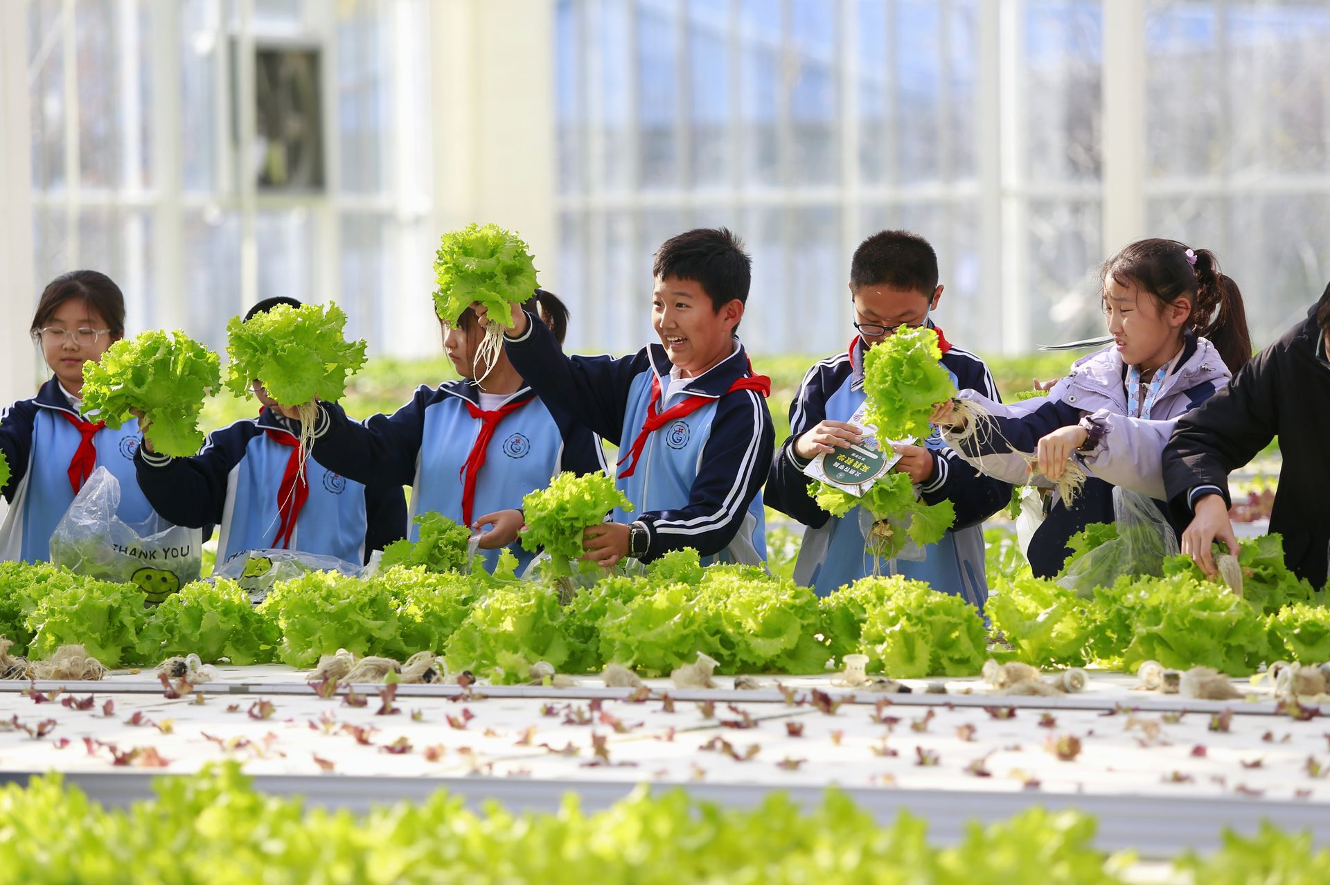“没有土壤,植物怎么生长?这里采用无土栽培技术,营养液替代土壤提供养分,温室里的传感器还能实时监测温湿度、光照数据。” 在智能联动温室里,北京农学院教师高坦坦正在为学生们讲解。广宁村小学六年级(1)班学生吴昊恩告诉记者:“看到这些绿油油的蔬菜在没有土壤的情况下,依然能够长得很好。对比班级种植箱里的作物,真切感受到科技种植的震撼。”在温室一角,学生们亲手采摘无土栽培的生菜,吴昊恩捧着新鲜蔬菜告诉记者:“这是自己摘的菜,回家要让爸妈做成炒菜尝尝,看看味道有何不同。”