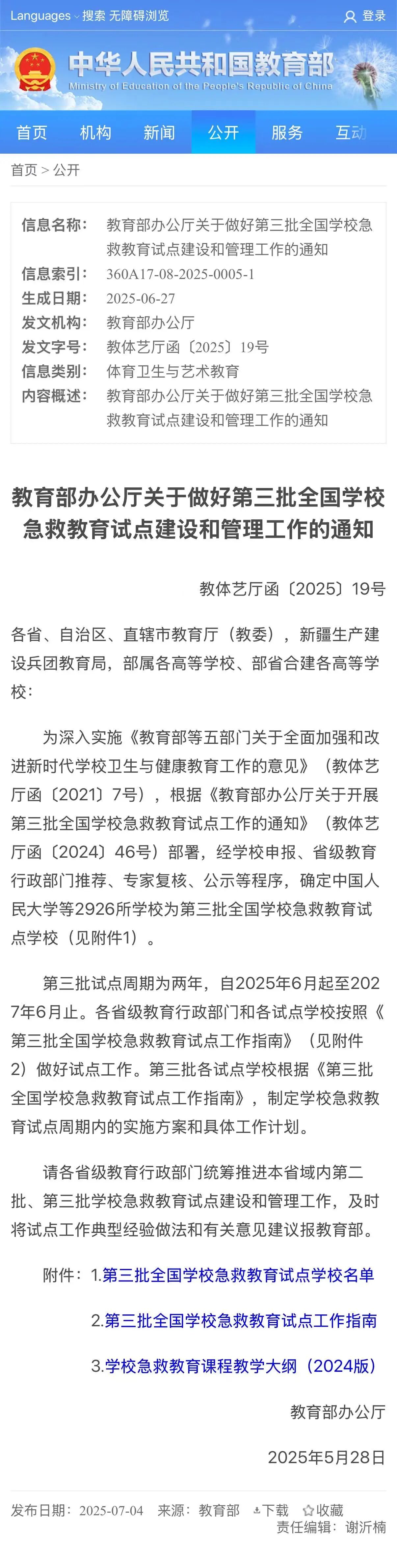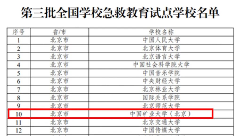 2025年5月,经学校申报、省级教育行政部门推荐、专家复核、公示等程序,教育部正式发文,确定学校为第三批全国学校急救教育试点学校。