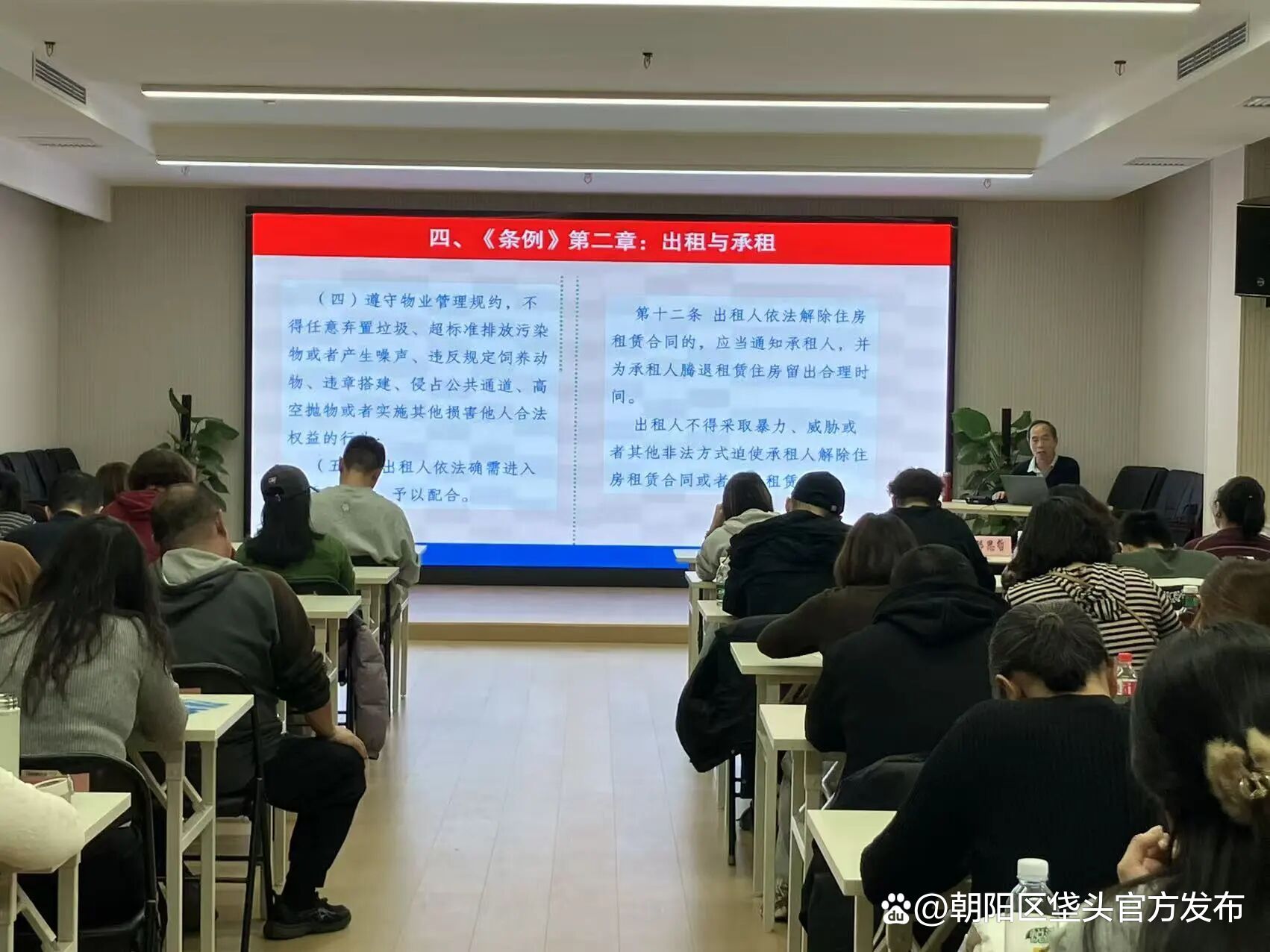 街道司法所负责人王久全同志以“普法就‘宪’在,全面深化垡头街道‘法治带头人’培养工程”为主题,围绕出台背景、制定思路、立法目的、具体法条等内容,讲解2025年9月15日施行的《住房租赁条例》,帮助与会人员对出租房屋管理有了更清晰全面的认识,提高了对相关问题的知识储备。