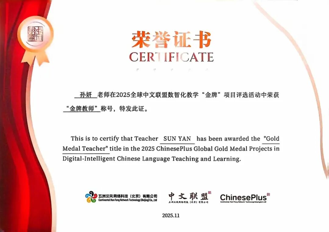教师孙妍凭借多年来的深厚育人情怀与实践打磨的精湛教学技艺,光荣获评“金牌教师”。她在课堂上突破传统语言教学范围,将当代中国的发展和实践有机融入教学内容,通过课堂教学、实践教学等多种方式让国际学生从中读懂当代中国国情、感知中华文化魅力。