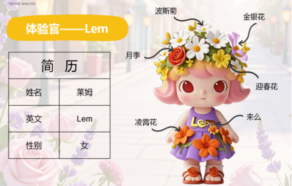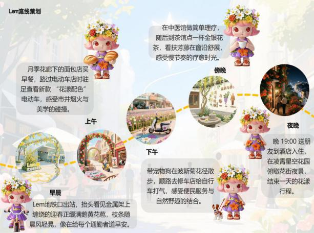 2.文化赋能点亮烟火,厚植人文底蕴。深挖来广营花街文化内涵,以“文化赋能+业态联动”为核心,打造专属IP形象,提升区域品牌识别度与消费吸引力。创新引入虚拟“体验官Lem”,以其一日生活为叙事线索,串联地铁站点、商业空间与农文旅资源,构建“出站赏花—商街购礼—农园采摘”微度假体验闭环,增强居民与游客的参与感、认同感。