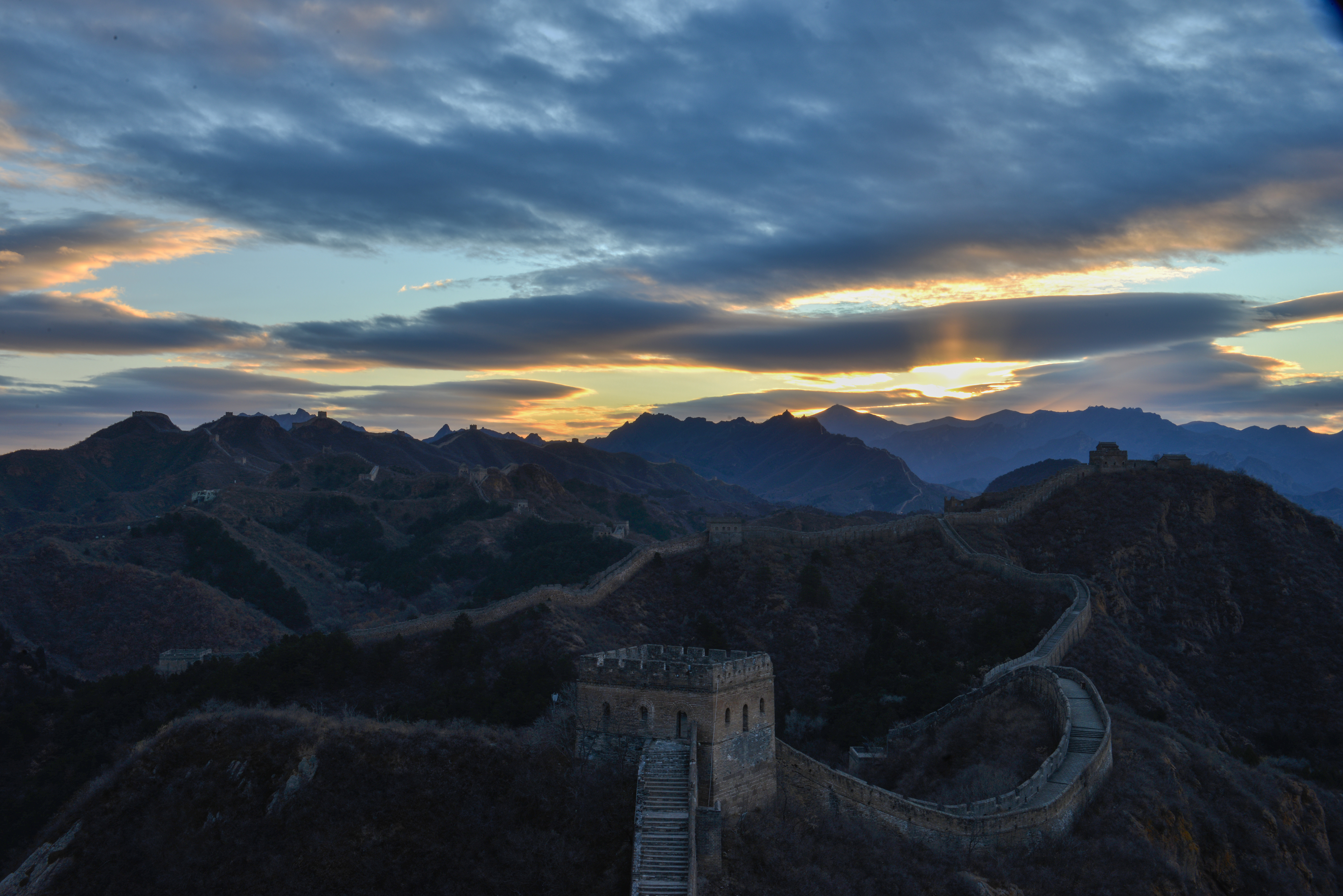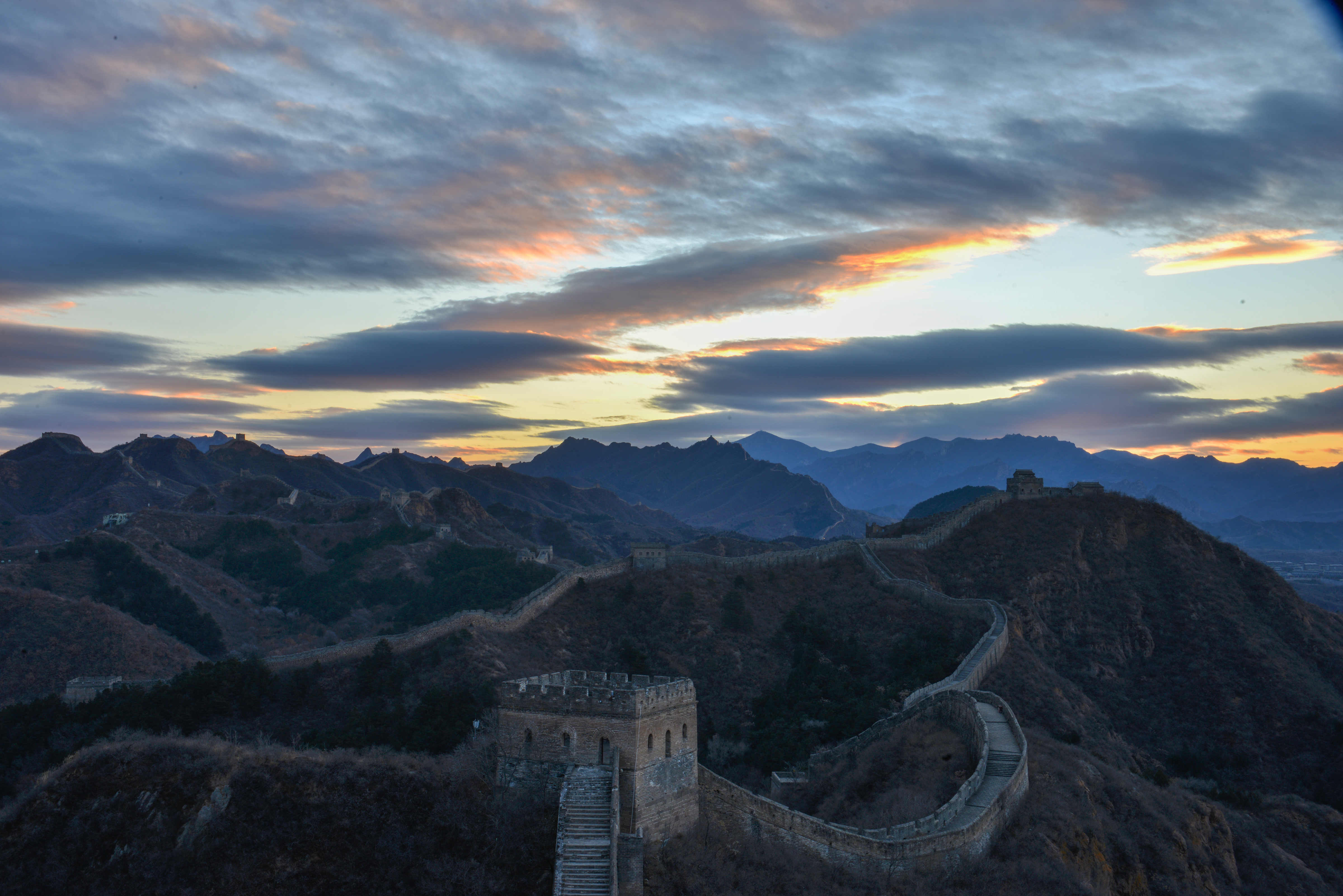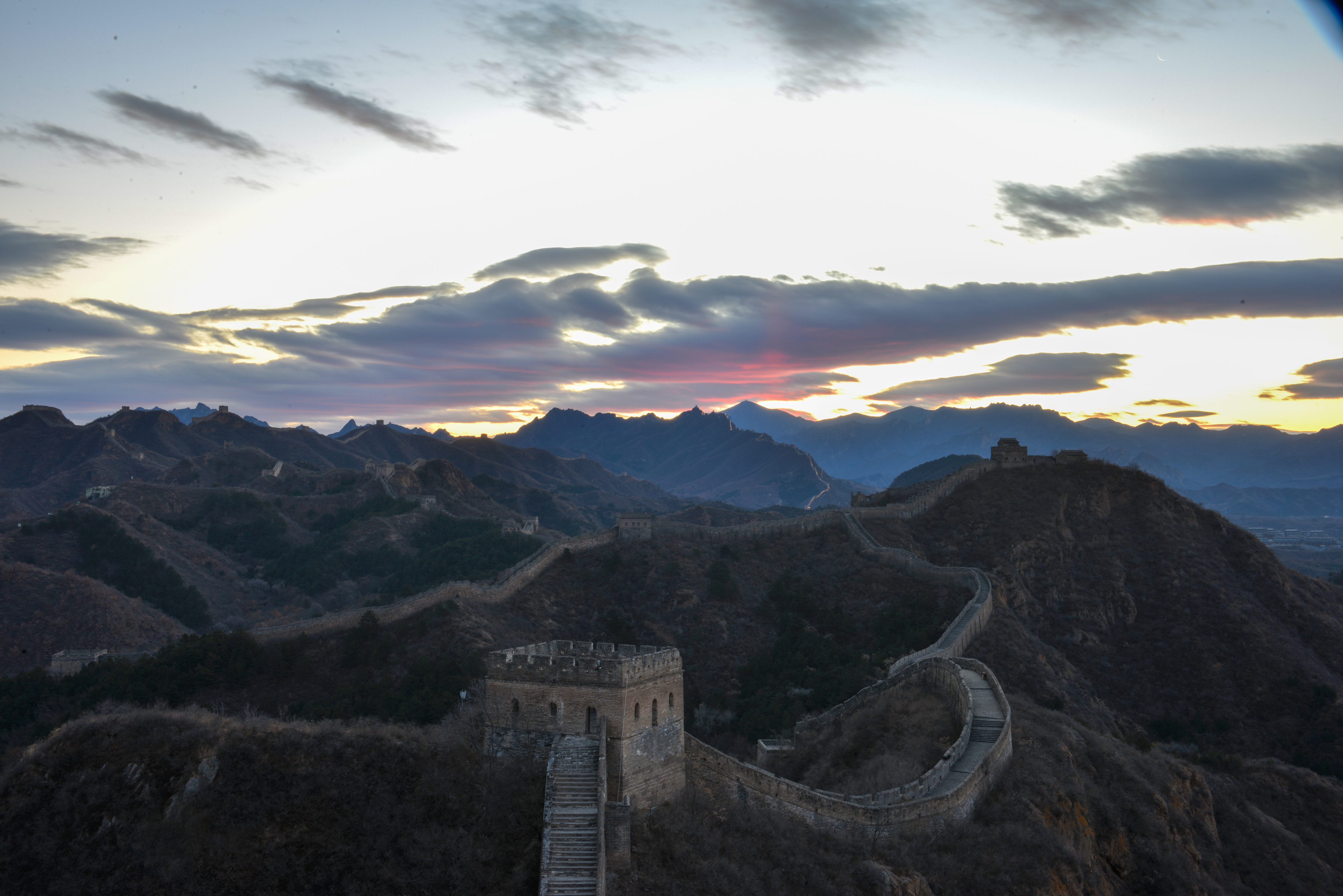 2025年11月18日清晨,河北省承德市滦平县的金山岭长城,出现瑰丽朝霞景象。云霞璀璨夺目,似轻纱飘舞惟妙惟肖,与古长城相互辉映,风光旖旎,美如画卷。