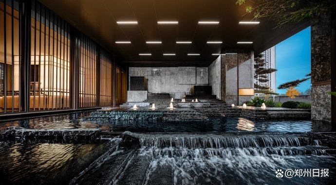 金投·天宝府门厅两侧,以宋代山水画的“层叠皴法”与郑州古运河文化为灵感的景观水系流淌着宋韵之魂。水流自高处跌落,沿石阶潺潺而下,喷泉汩汩、片石层叠、灌木丛生、树影婆娑,在一方小天地中,营造山中流水的跌宕起落之美。