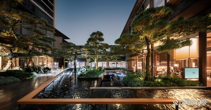 置身金投·天宝府打造的“松韵”主题下沉庭院,奇松交翠描秀色,飞瀑流泉入画来。水流循着自然之道、地形之势,聚、散、转、跌、绕,14棵油松冠如华盖、虬枝错节、苍翠古朴,庭院中草木葳蕤,山石并秀,“明月松间照,清泉石上流”的诗画意境呼之欲出,大隐于世的“壶中天地”境界浑然天成,一场跨越时空的美学对话渐次铺陈。