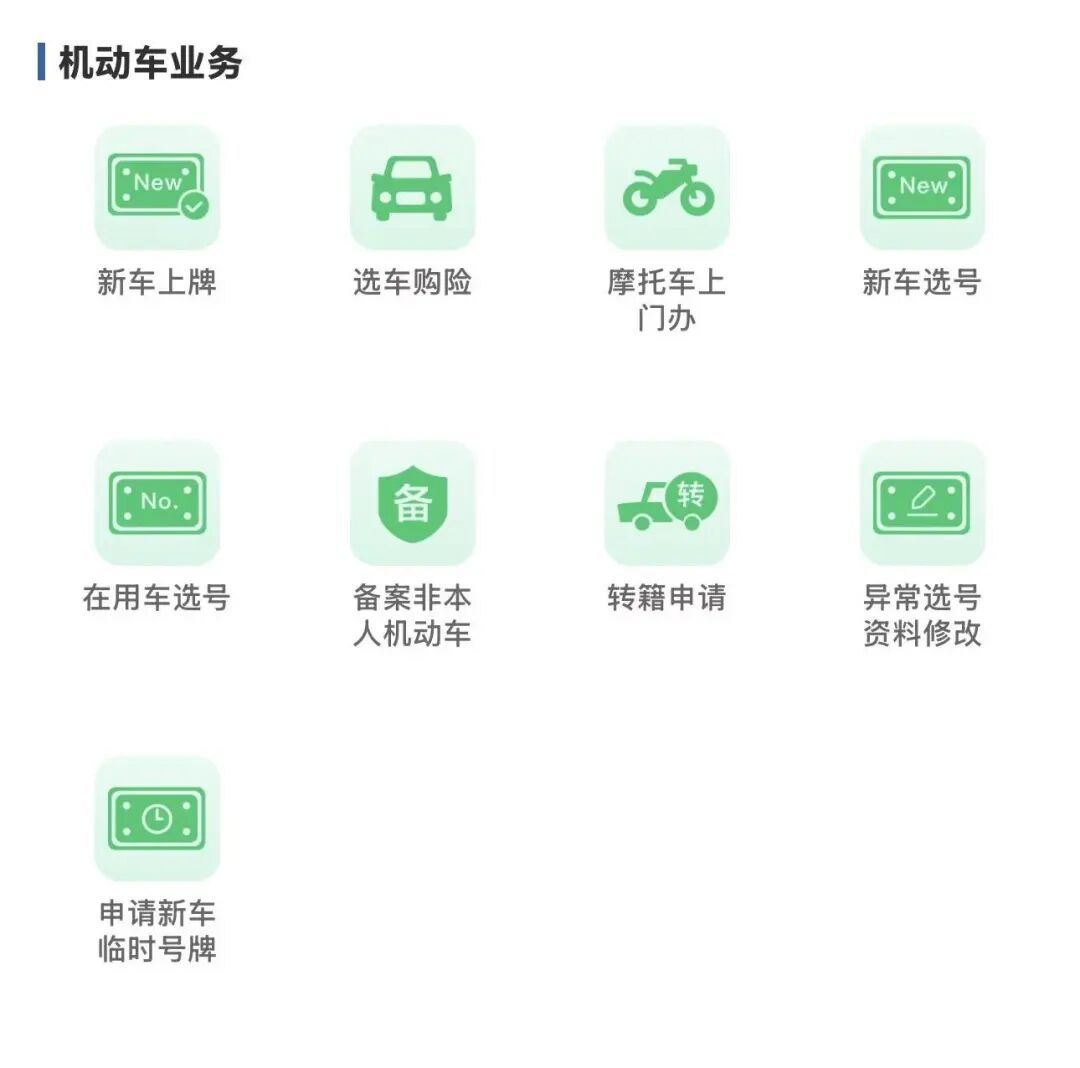 新车上牌、选车购险、摩托车上门办、新车选号、在用车选号、备案非本人机动车、转籍申请、异常选号资料修改、申请新车临时号牌。
