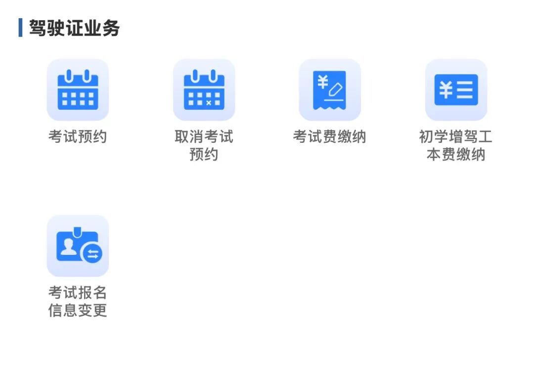 考试预约、取消考试预约、考试费缴纳、初学增驾工本费缴纳、考试报名信息变更。