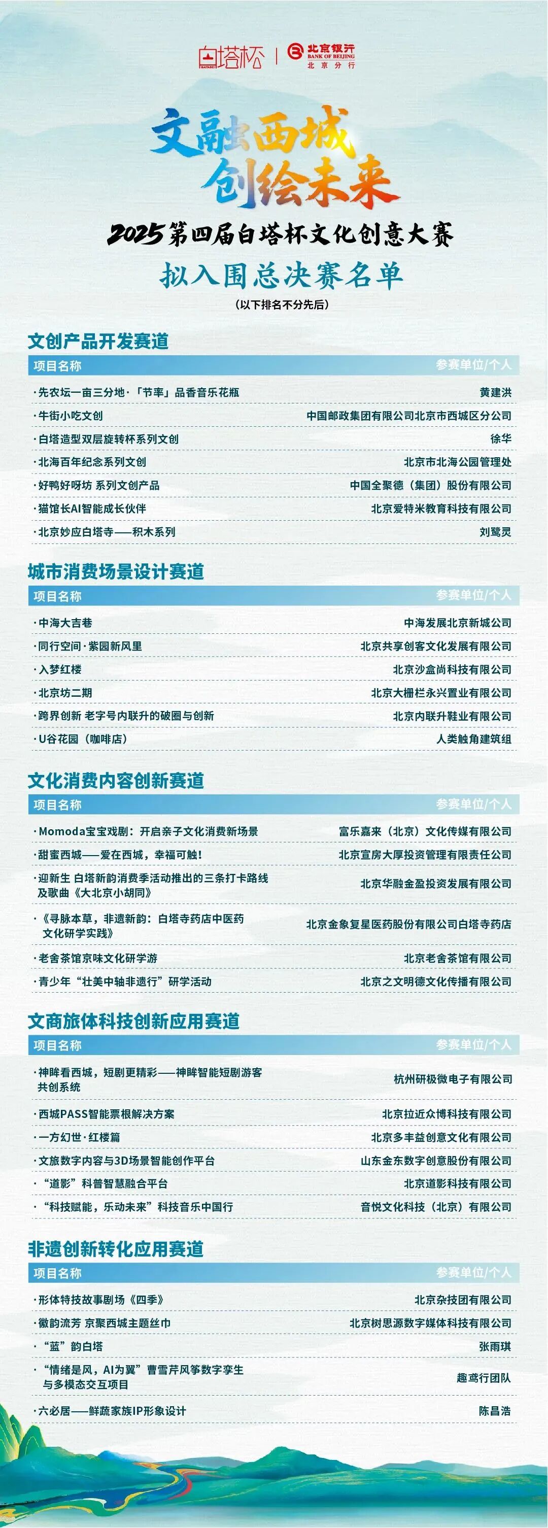 为进一步提升西城区历史文化资源价值,持续为北京全国文化中心建设注入创新动能,北京市西城区人民政府于2025年9月至12月举办2025第四届“白塔杯”文化创意大赛(以下简称“大赛”)。大赛以“文融西城 创绘未来”为主题,共设置文创产品开发、城市消费场景设计、文化消费内容创新、文商旅体科技创新应用、非遗创新转化应用五大赛道,入围复赛共计150件参赛作品。目前,已完成复赛评审。拟入围总决赛30件参赛作品名单现公示如下: