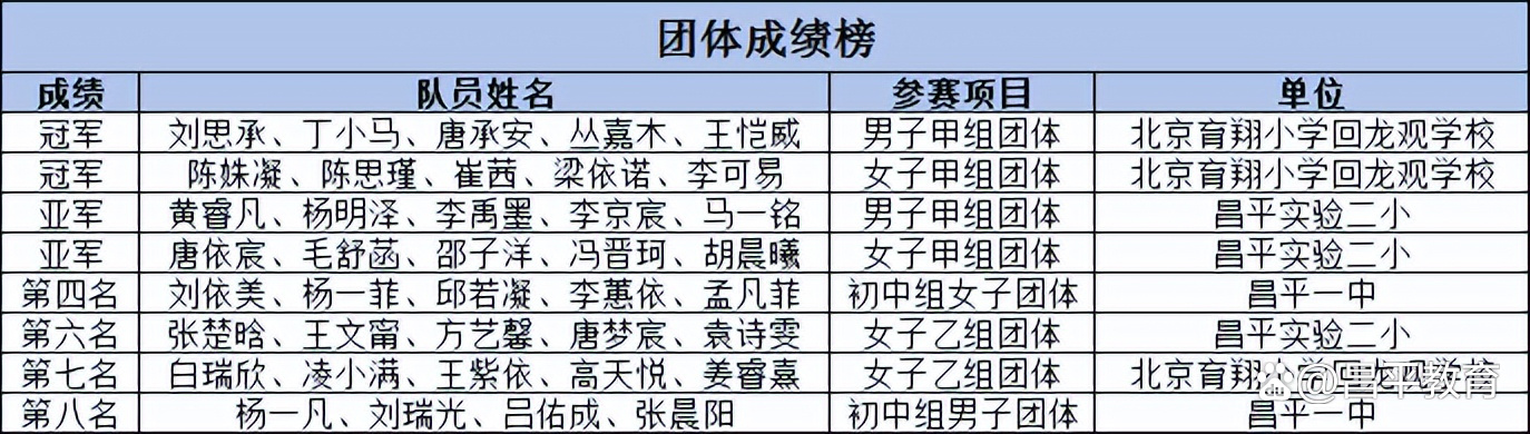 昌平10支团体队伍,8支打入北京市八强;甲组团体更是战绩辉煌,4支参赛队伍包揽冠、亚军。