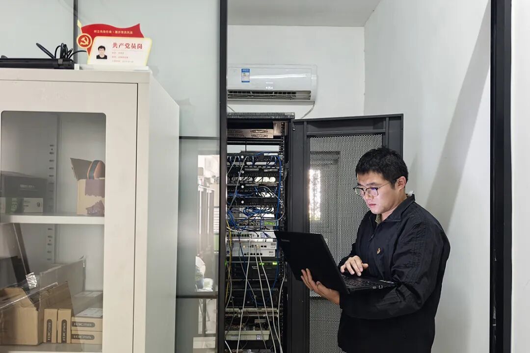 北京大众在线网络技术有限公司党支部党员带头在机房调试系统漏洞。