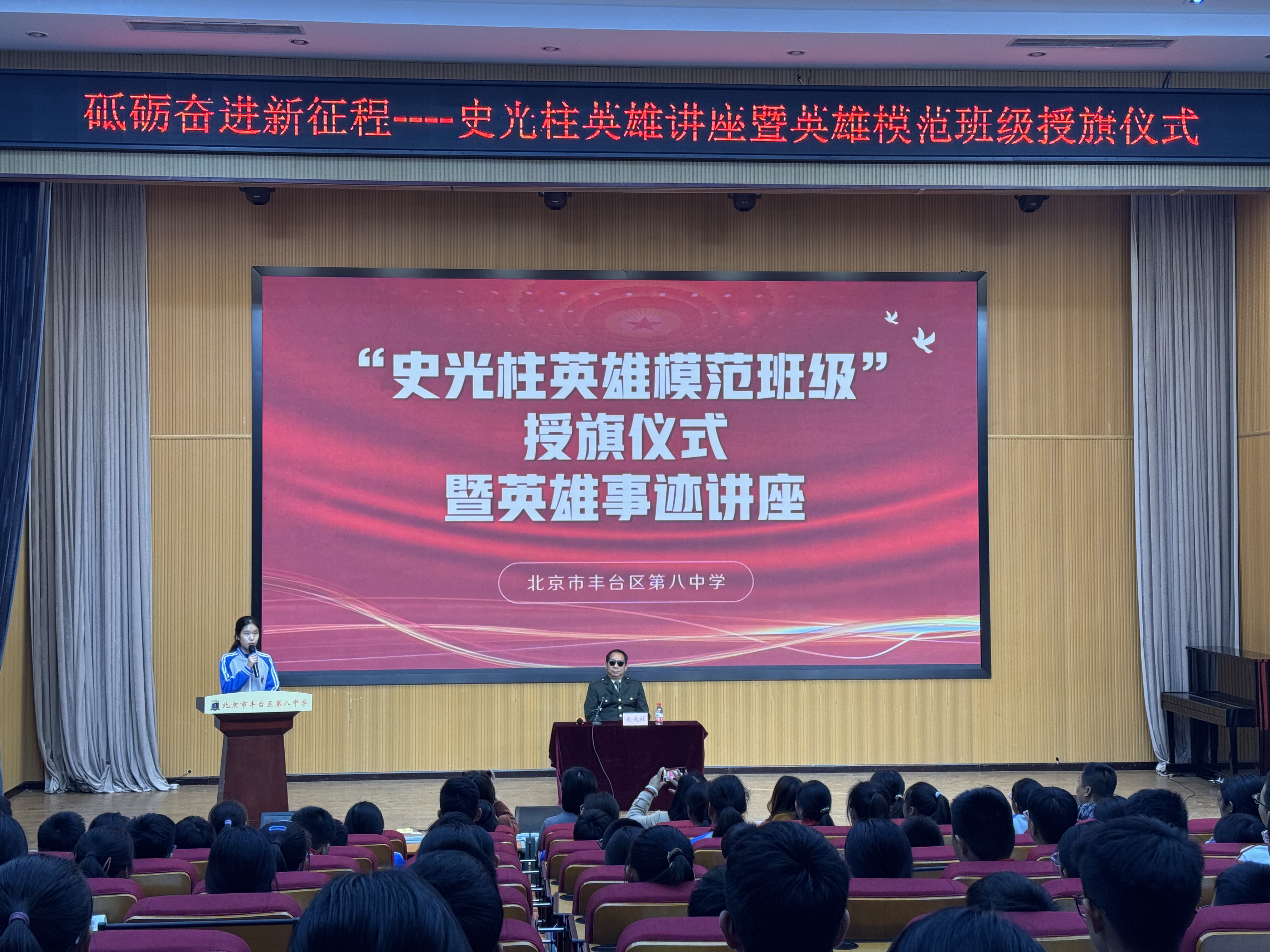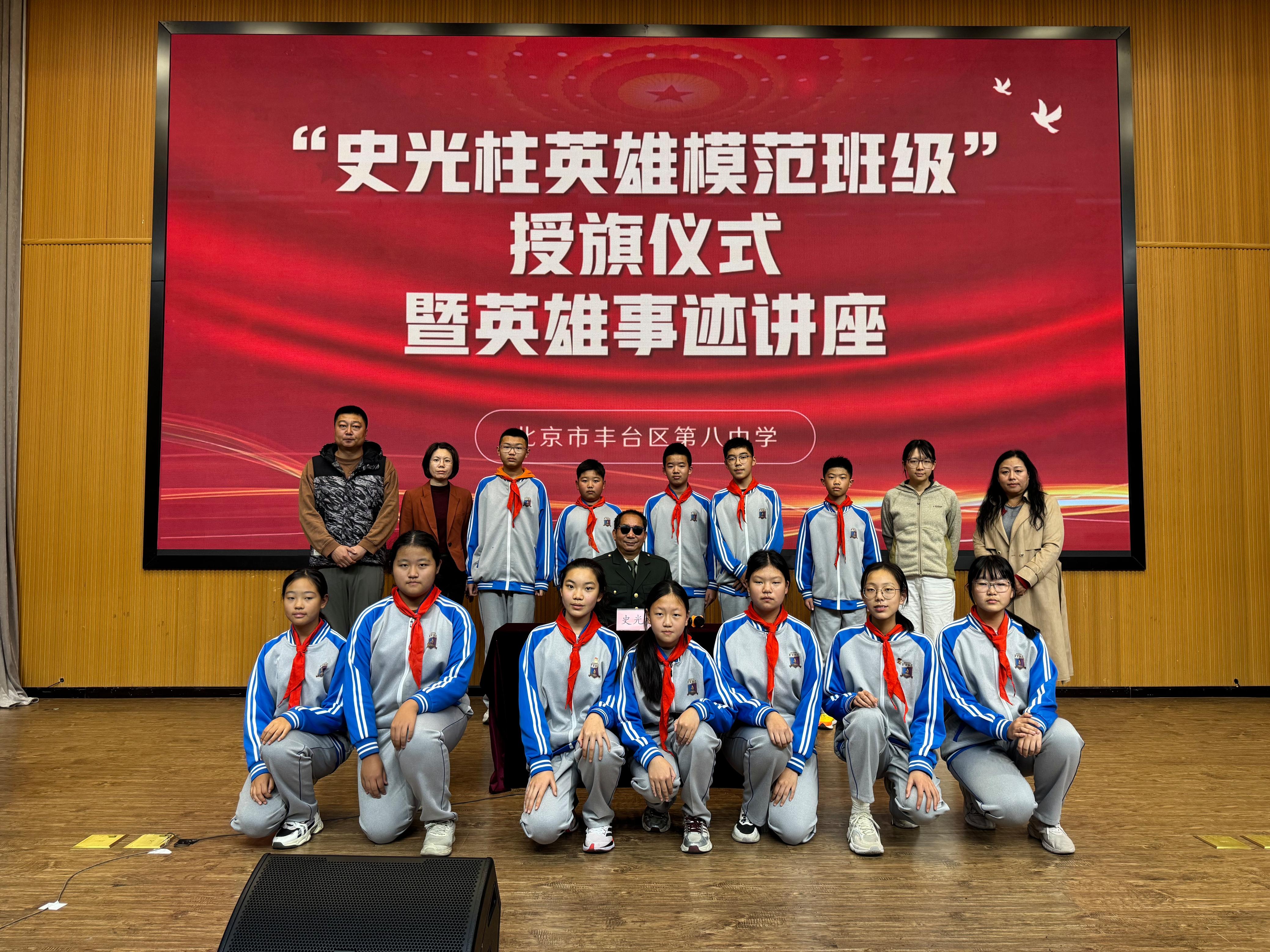 为深化区域“大思政课”育人格局,将红色基因传承融入创新人才培养全过程,近日,在丰台区教育委员会学生发展中心(区青少年创新学院)的组织下,丰台区第八中学举行“史光柱英雄模范班级”授旗仪式暨事迹报告会。作为丰台区“百场爱国主义英雄报告进校园”后续持续深化活动的一环,英雄班级(中队)授旗是我区构建“听英雄故事—悟英雄精神—做英雄传人”育人闭环的生动实践,旨在为学子成长筑牢精神根基,锻造担当民族复兴大任的时代新人。