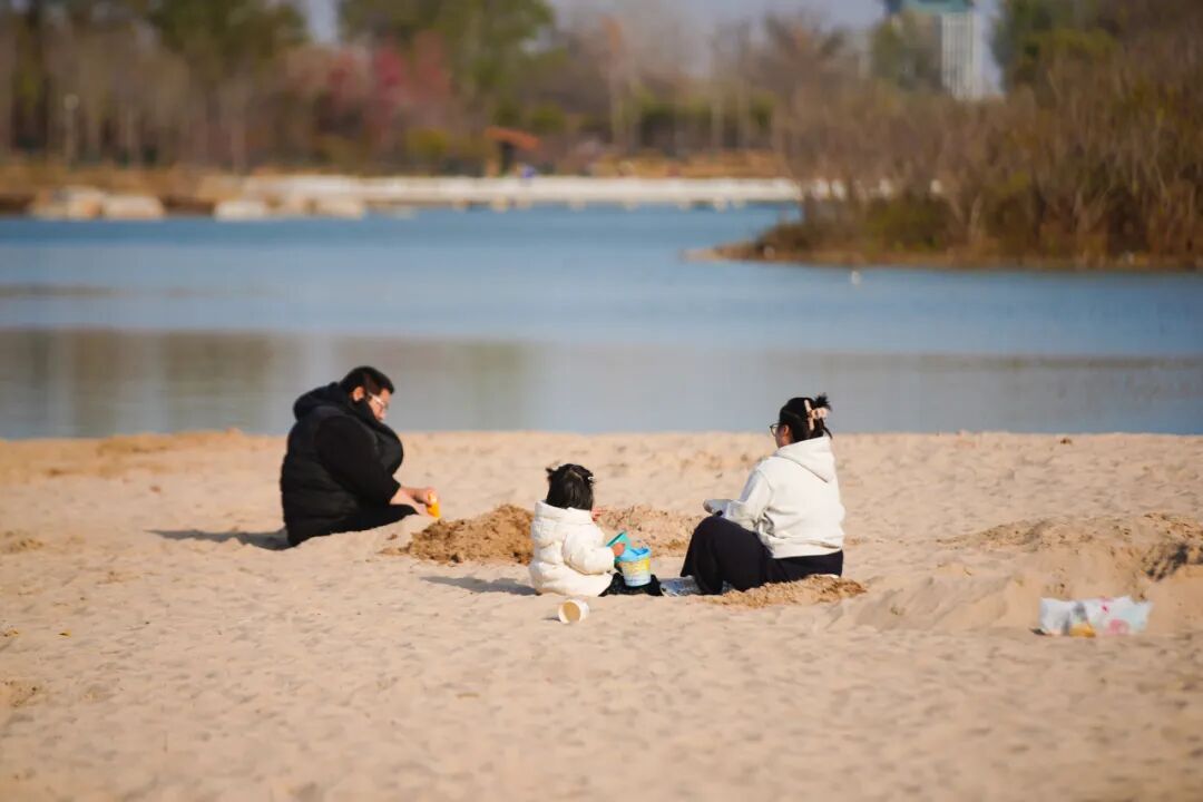 工作日的中午,白沙滩依然聚集了不少市民。据了解,儿童乐园区域的白沙滩,沙子经过特殊处理,细腻柔软,更适合儿童玩耍。孩子们忙着筑城堡,荡秋千,三三两两的老年人在湖边散步,构成了一幅和谐的城市休闲图景。