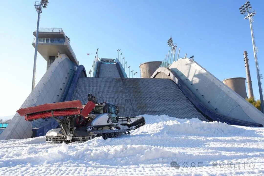 记者来到此次赛事举办地首钢滑雪大跳台,数台碎冰机低鸣交织,压雪车推雪爬行,将“冰状雪”推上、压实,造雪工作正在如火如荼进行中。