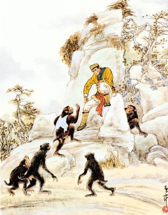 在第一回的描写中,虽然石猴和其他猴子以及飞禽走兽都是以拟人化的形象出现的。但是他们的生活,还是贴近群居动物,而不是人类的。我们应该还记得,石猴是怎么成为猴王的,就是勇敢地冒险一跃。开始猴子们进入水帘洞的时候,“一个个抢盆夺碗,占灶争床,搬过来,移过去。”完全忘记了先前所说的,“那一个有本事的,钻进去寻个源头出来不伤身体者,我等即拜他为王”这样的承诺。但是石猴自己却没有忘记,于是说道:“列位呵,人而无信,不知其可。”提醒大家不要光顾着自己搬东西,要按照先前的约定拜他为王。这些猴子倒也真讲信用,这样石猴就变成猴王了。