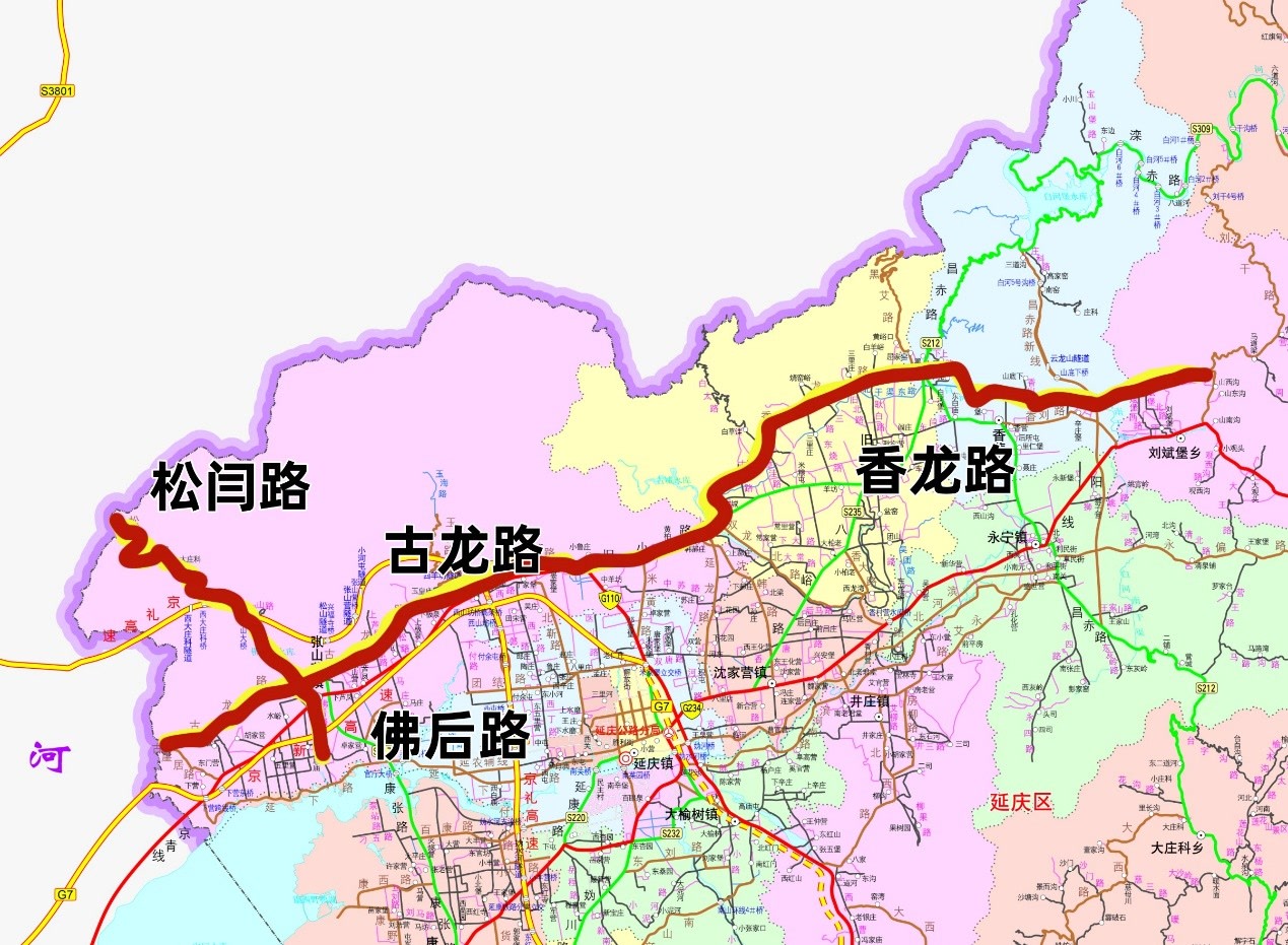 路线整体位于延庆区北部,惠及张山营镇、旧县镇、香营乡及刘斌堡乡四个乡镇,是延庆区“三横五纵”路网骨架中最北侧的一“横”,是延庆北部主要的东、西向公路,主要功能是方便延庆北部地区村镇间村民出行,极大带动当地特色农业、旅游等产业发展和区域社会经济发展。沿线旅游资源丰富,有古崖居、玉渡山、北京延庆奥林匹克园区、龙庆峡、万科石京龙滑雪场等多处知名景区,以及沿线的8个民俗旅游村、300多个民俗旅游接待户,开展了形式多样的民俗旅游项目。