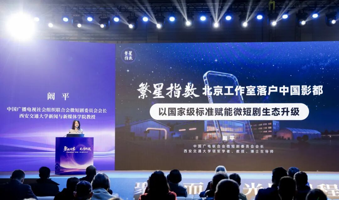 11月22日,在中国影都短剧产业发展一周年成果发布会上,中国广播电视社会组织联合会微短剧委员会会长、西安交通大学新闻与新媒体学院教授阚平领衔的“繁星指数”北京工作室正式落户中国影都,将以国家级标准赋能微短剧生态升级。