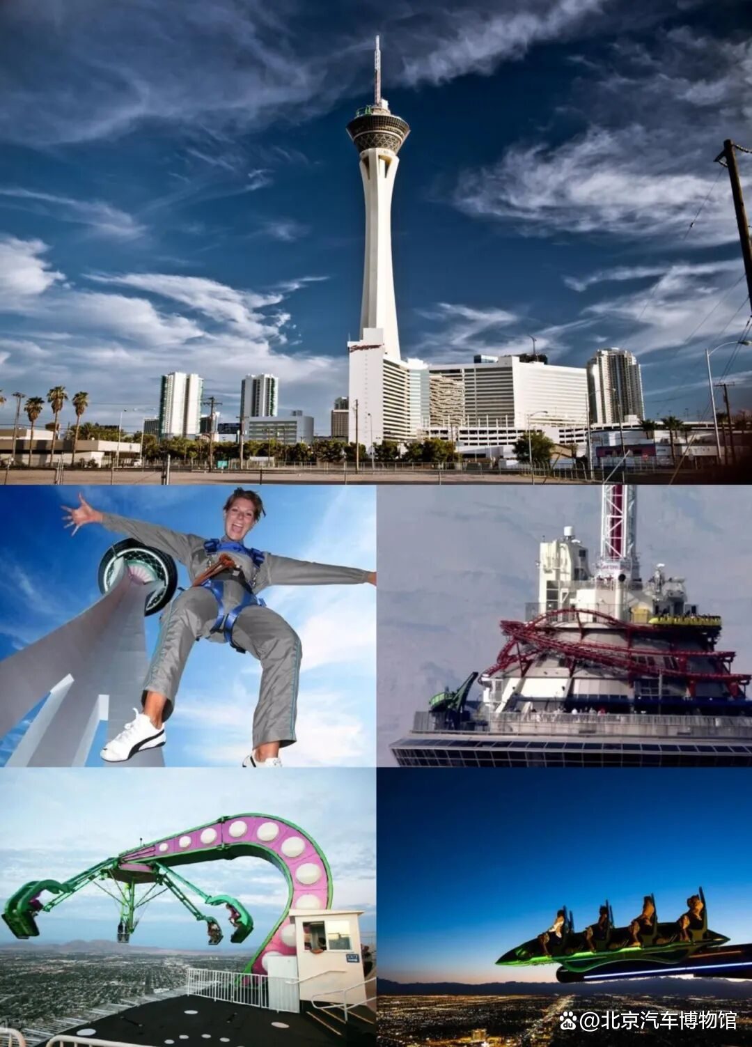平流层塔(Stratosphere tower)酒店的最顶层,距离地面约350米,是世界上最高也是最危险的游乐场,游戏项目很单调,只有4种:SkyJump(蹦极)、The High Roller(过山车)、Insanity the Ride(旋转飞椅)、X-Scream(跷跷板),但每一项都是坐拥世界之最的极端惊险游戏。