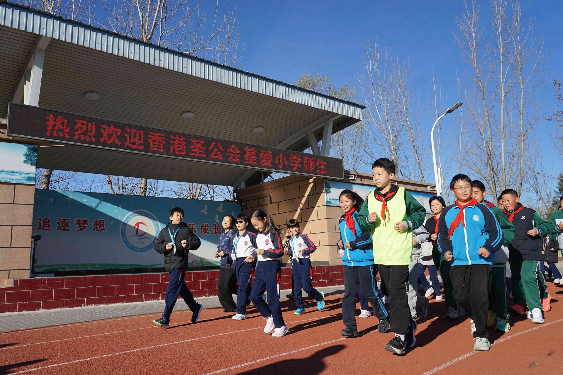 随后,两校学生在运动场上共同参与了绳操、踢毽和乐跑等特色项目展示。香港学生积极参与,与本地学生同台竞技、互相交流,现场气氛热烈,欢声笑语不断,拉近了两地学生的距离。