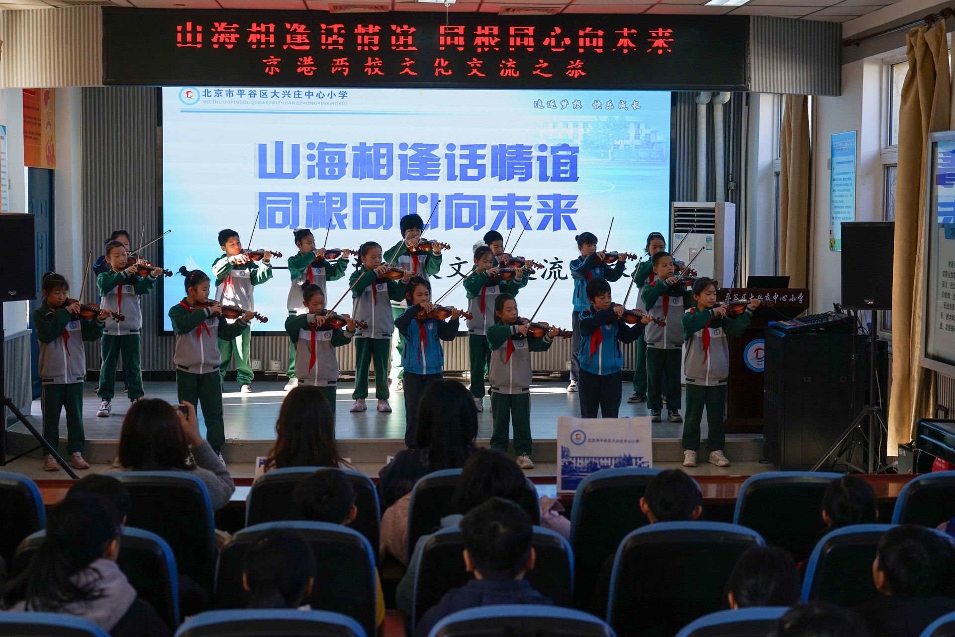 在大会议室,侯术强陪同香港师生欣赏了学校小提琴社团的表演。侯术强在致辞中表示,京港两地同根同源、文脉相连,教育是传承文化、凝聚情谊的重要桥梁。希望两地学子通过交流活动增进了解,收获友谊,共同守护中华优秀文化。随后,香港圣公会基爱小学与大兴庄中心小学互赠纪念礼品,表达彼此间的友好情谊。