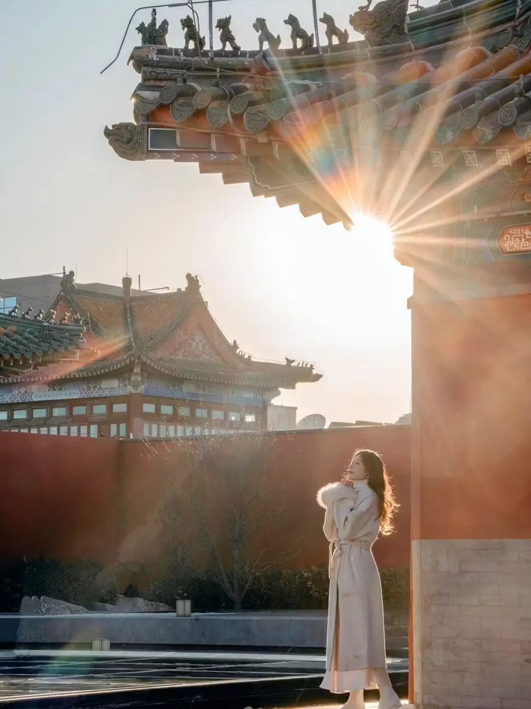 在角楼东南侧的护城河边架好设备,拍摄日出时“金光镀瓦”的瞬间,捕捉光影在城砖上的流动变化;待天光渐亮,沿景山前街漫步,看晨雾中的古建轮廓。