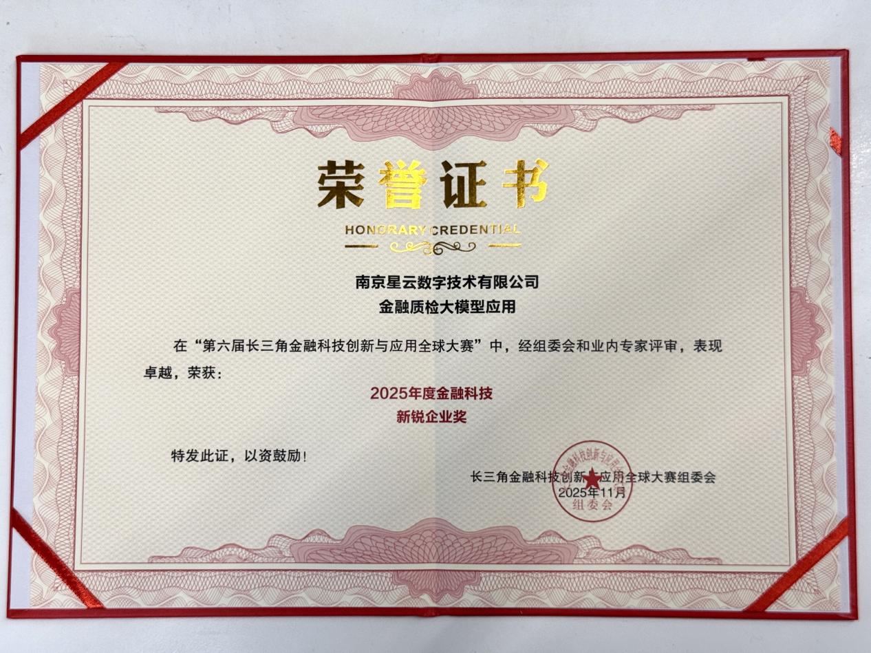 星云数字凭借“金融质检大模型应用”项目,以其基于大模型创新技术,具备准确率高、成本低、泛化能力强、抽检效率高、标准化难度低、管理难度小等优点,从众多参赛项目中脱颖而出,得到专家评审团的一致认可,一举斩获“2025年度金融科技·最佳新锐企业”奖项。