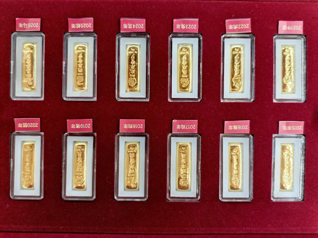 据介绍,本组贺岁金条由中钞长城贵金属有限公司铸造,上海金币投资有限公司总经销。全套包含1000克、500克、200克、100克、50克和30克,共六个规格,最大发行量分别为140条、400条、1500条、11900条、18000条和9000条,成色均为99.99%纯金。
