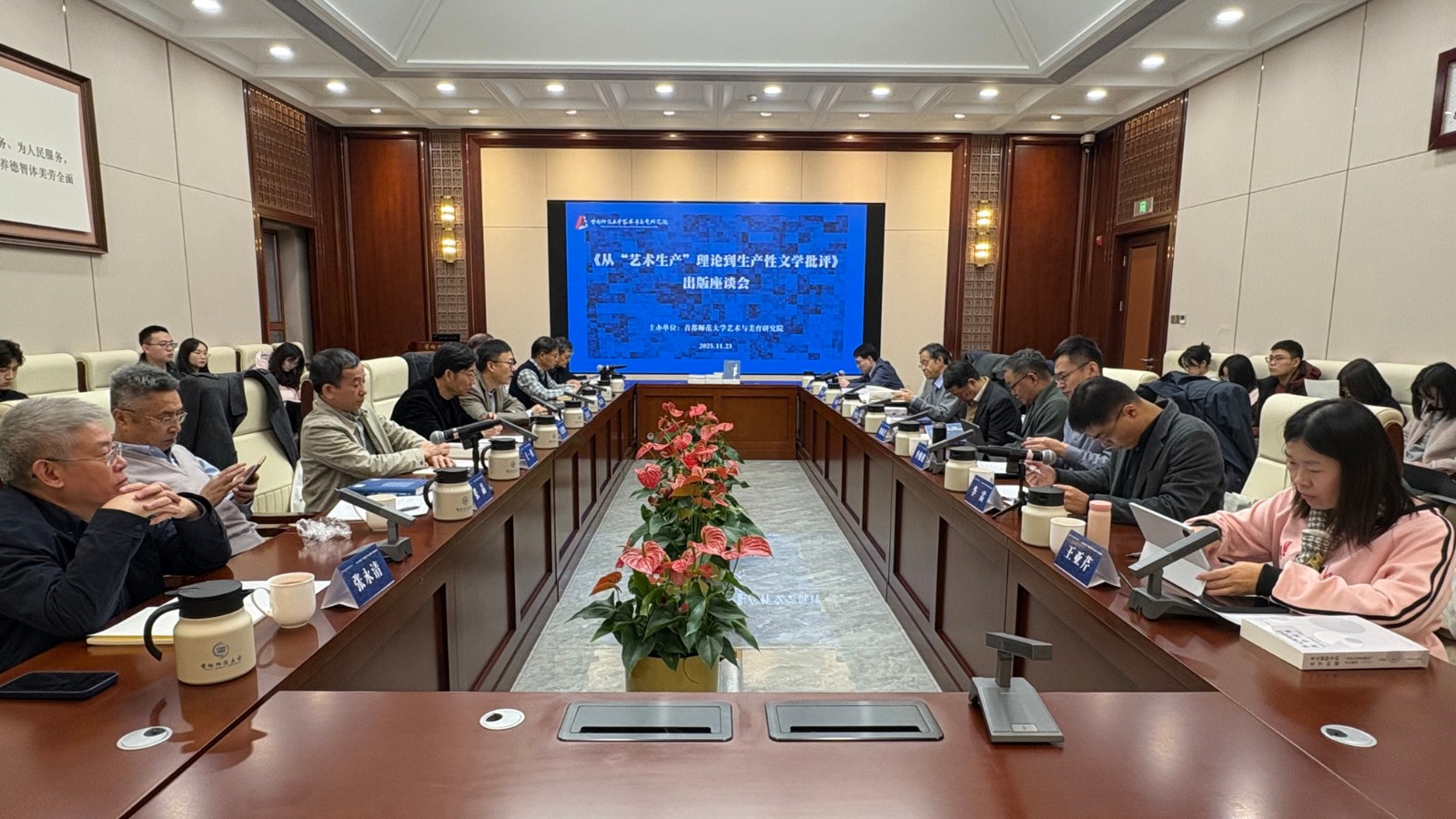 11月23日,由首都师范大学艺术与美育研究院主办的“《从‘艺术生产’理论到生产性文学批评》出版座谈会”在我校举行。学校党委常委、副校长郑文涛出席会议并致辞。来自中国社会科学院、国家行政学院、北京师范大学、中国人民大学、中国传媒大学、北京语言大学、华南师范大学、南昌大学、杭州师范大学、《文艺研究》杂志社等高校与科研机构的15位专家学者,围绕文学艺术理论前沿议题展开了热烈研讨。座谈由首都师范大学艺术学部主任、艺术与美育研究院院长王德胜教授主持。