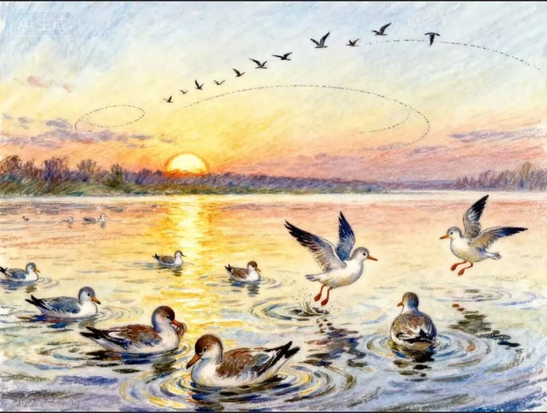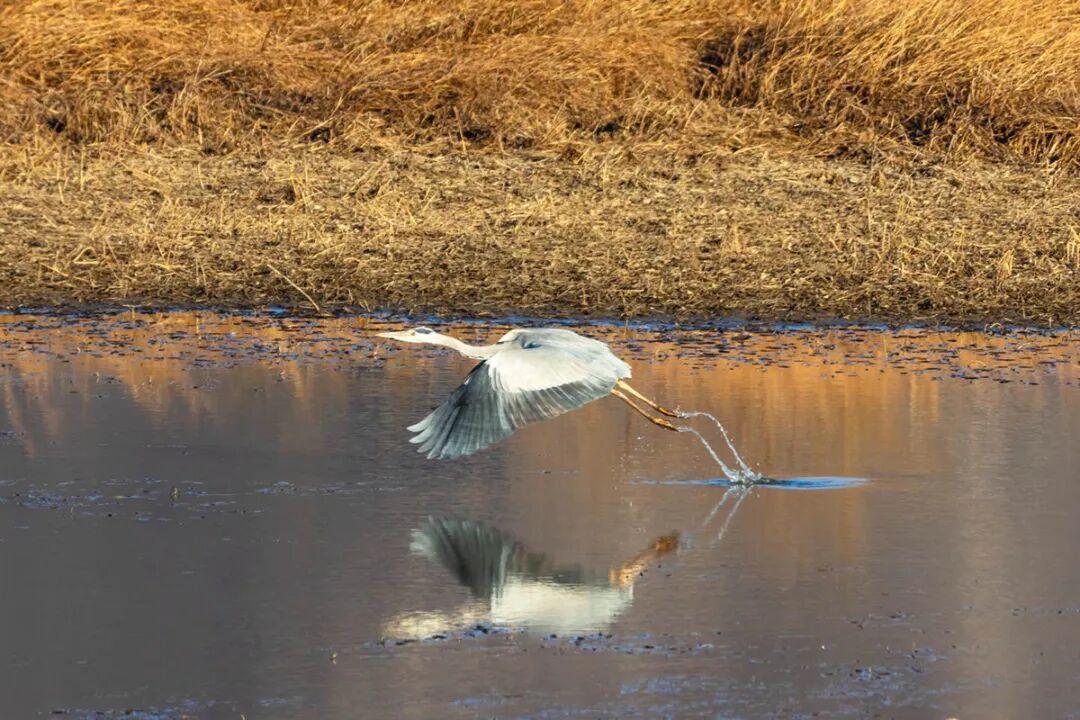 傍晚时分,夕阳为潮白河镀上金边。水鸟或结伴游弋,或梳理羽毛,偶有晚归的鸟儿掠过天空,划出优美弧线。