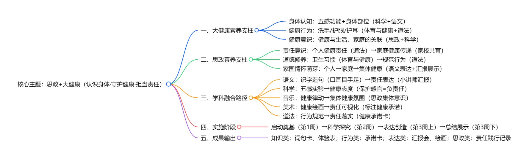 我们以“健康+思政”为纽带,打破学科界限,构建“语文表达—道法启蒙—科学探究—艺术表现—数学应用”五维融合的课堂生态,让学生在多元学习中理解健康、践行责任。
