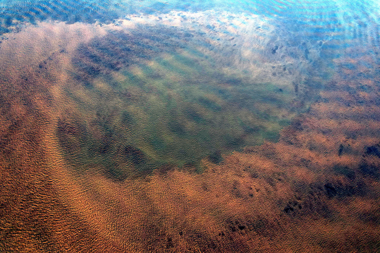 钱塘江潮水是“沙水”,是土黄色的水,江底也大都是褐色土黄色滩涂。在夕阳映照下,远远地,我看到了江面上有一小块从来没有看到过的绿色水域,间或好像还伴有亮丽的黄颜色,中间又是深褐色的。于是,连忙下降飞行高度,根据拍摄需要从100米降到70米,找准时机一边飞行一边拍摄。不到半分钟,无人机就飞出了绿水区域,江面上又是一片土黄色了。