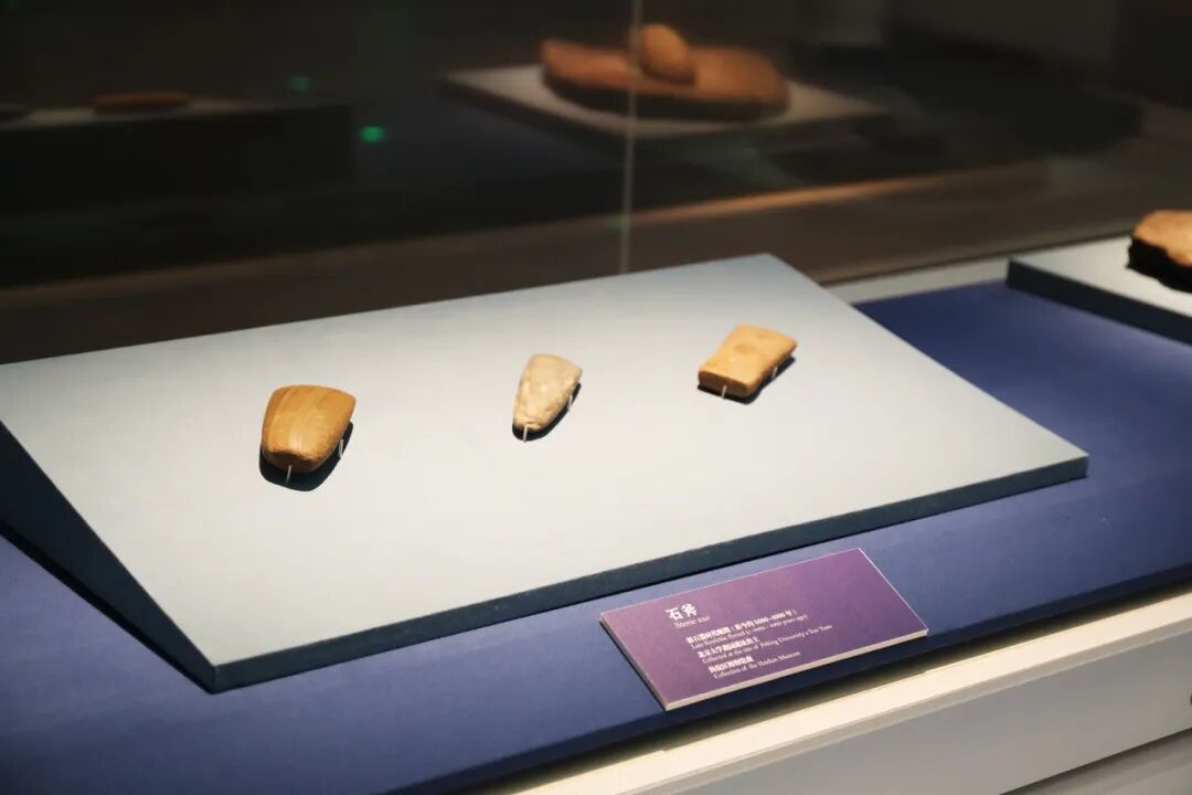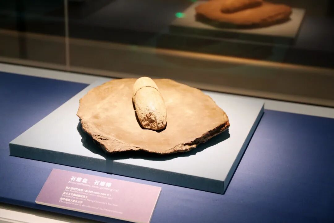 一旁是1997年在北大理科楼群施工中发现的石磨盘与石磨棒。这些谷物加工工具,见证了北方先民以粟、黍为主食的农业生活,也揭示了更精细的谷物加工方式——先民将粟、黍置于磨盘,以石棒碾压去壳,进而磨粉烹食。