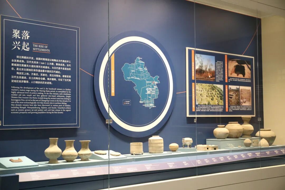 至汉代,为抵御北方游牧民族而筑的清河古城遗址,以及规模宏大的上地汉墓群,共同印证了海淀地理位置的优越性。出土的铁质农具与兵器,反映了冶铁技术的进步;彩绘陶壶云气缭绕,灰陶谷仓罐象征“仓廪实而知礼节”;“长天无极”瓦当则寄托了汉代先民对美好生活的祈愿。
